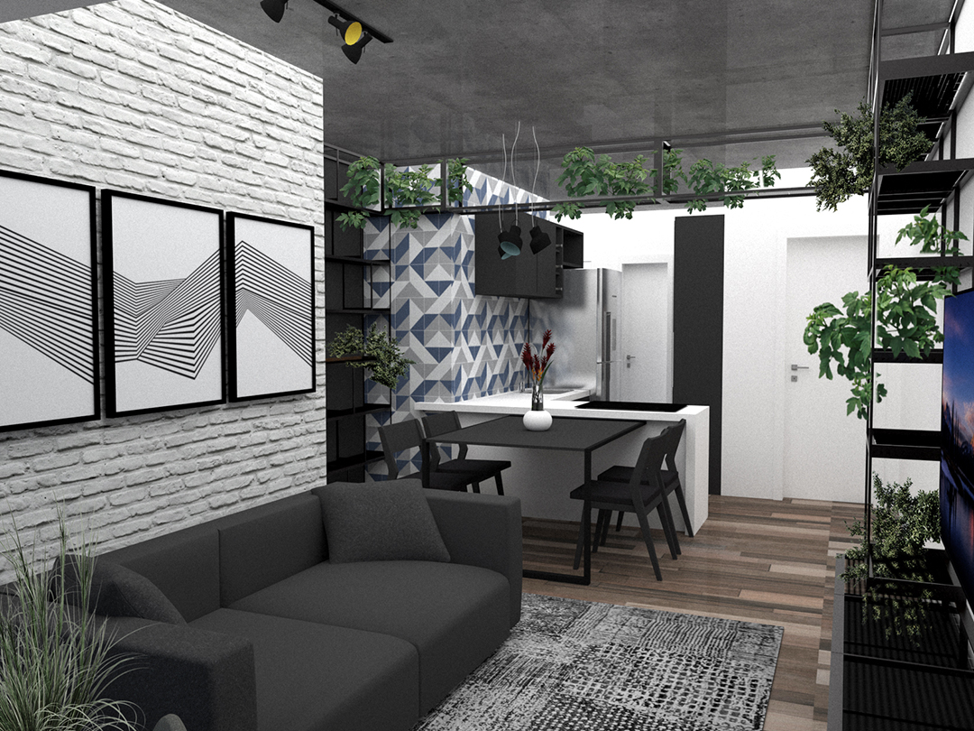 A cozinha, por sua vez, foi marcada com personalidade: um painel de ladrilho hidráulico foi inserido como ponto focal da área social, funcionando como elemento de destaque que une funcionalidade e estética.