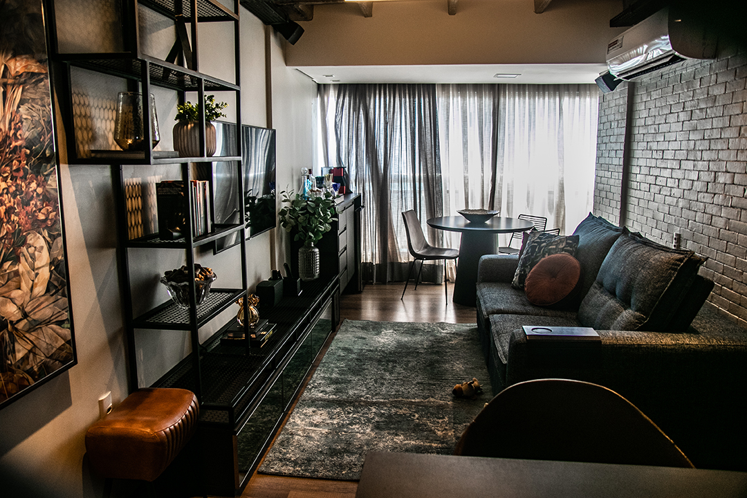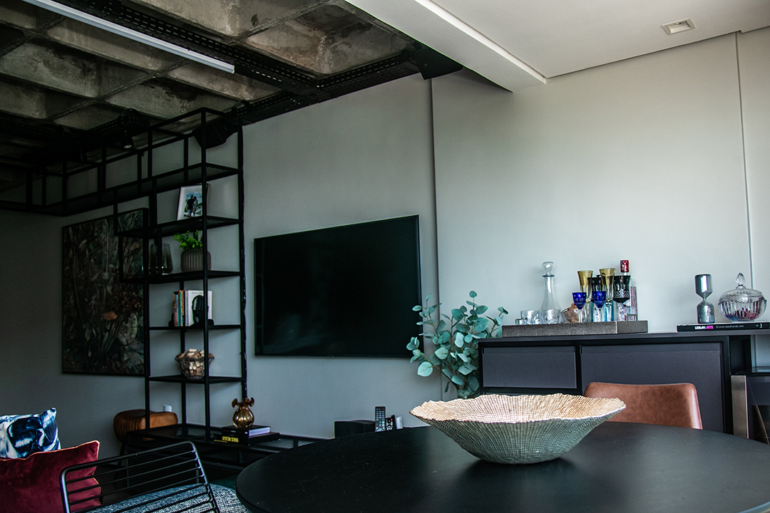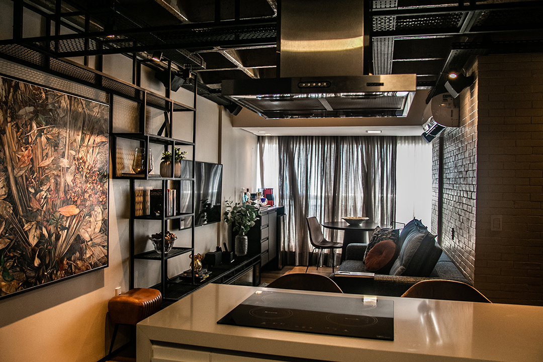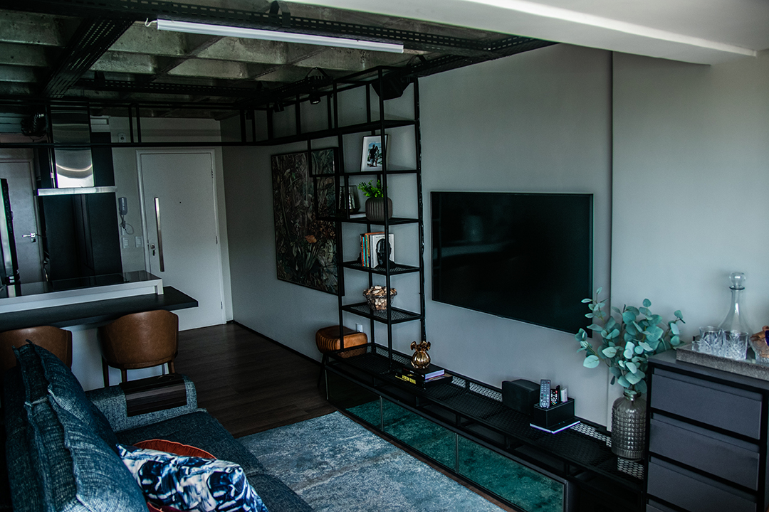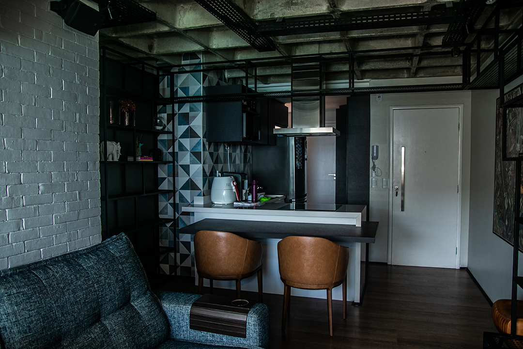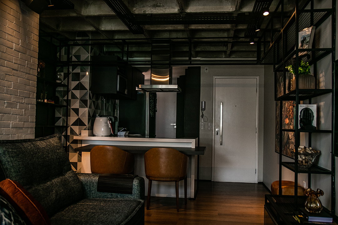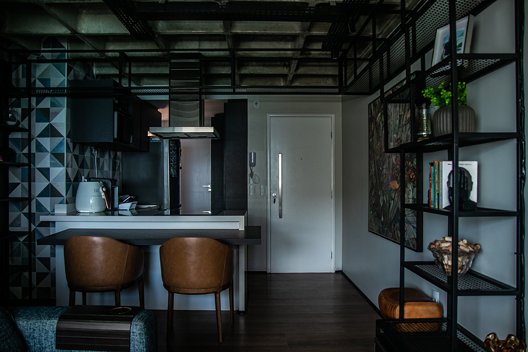 Talvez o traço mais distintivo do projeto seja o mobiliário de ferro feito sob medida, que funciona como um fio condutor entre os ambientes. Uma estante linear nasce na sala, percorre a frente da cozinha e se estende até os acessos ao quarto e escritório. A presença desse elemento em diversos espaços cria uma unidade estética coesa e marcante.