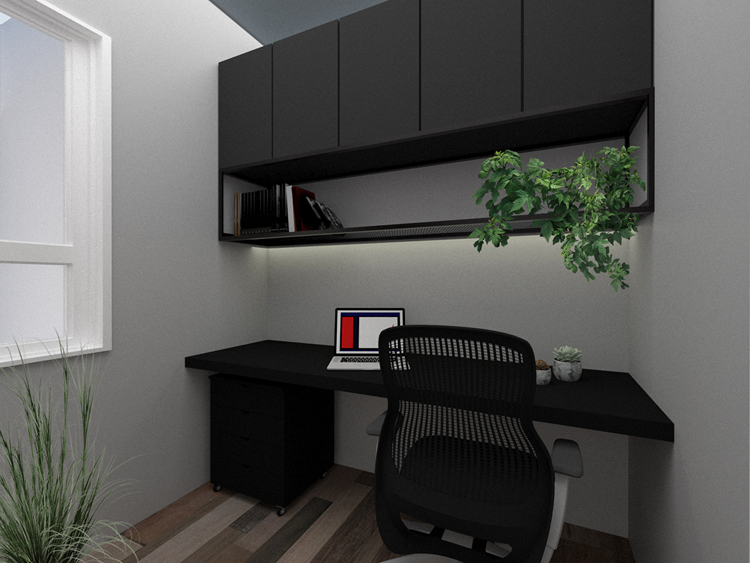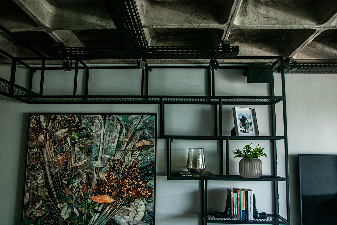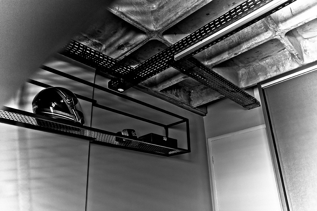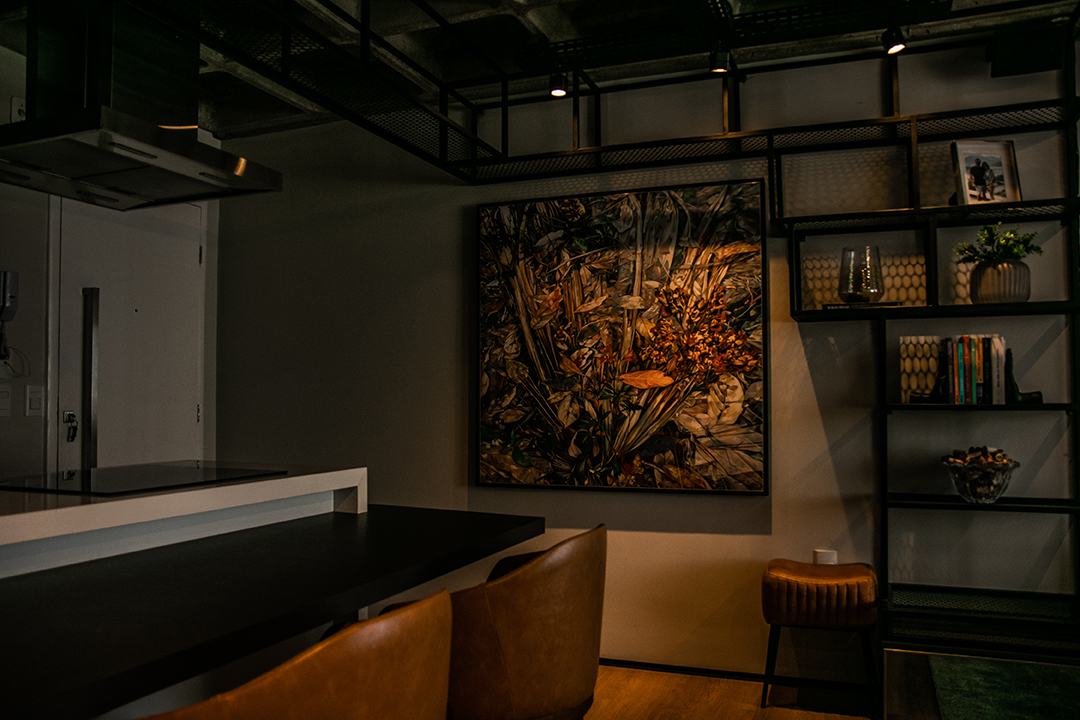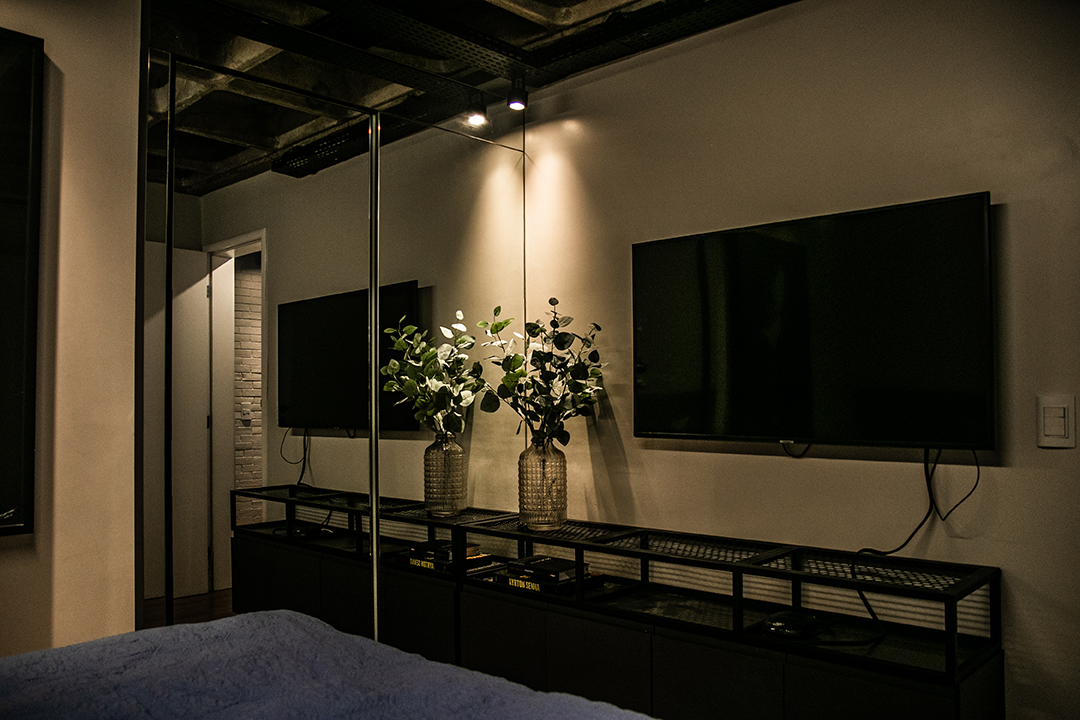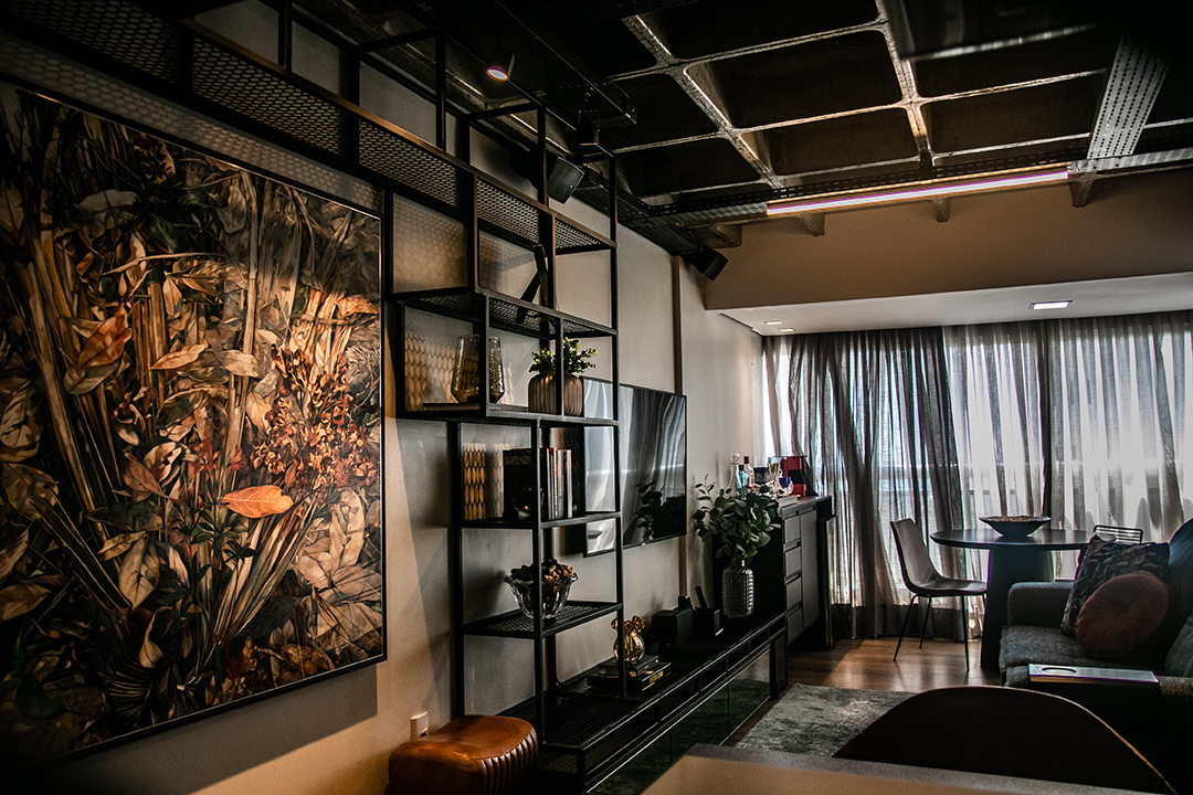 Talvez o traço mais distintivo do projeto seja o mobiliário de ferro feito sob medida, que funciona como um fio condutor entre os ambientes. Uma estante linear nasce na sala, percorre a frente da cozinha e se estende até os acessos ao quarto e escritório. A presença desse elemento em diversos espaços cria uma unidade estética coesa e marcante.