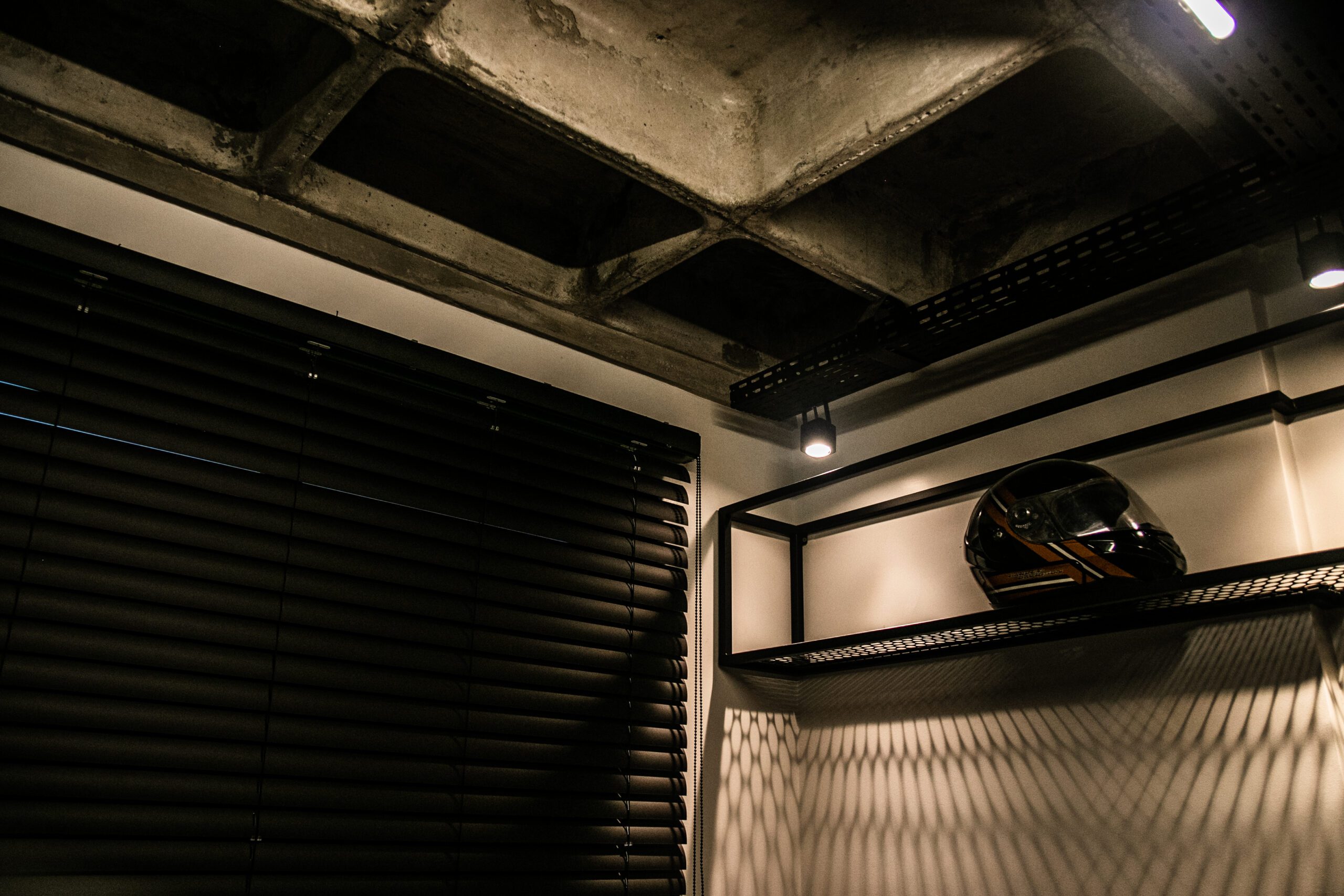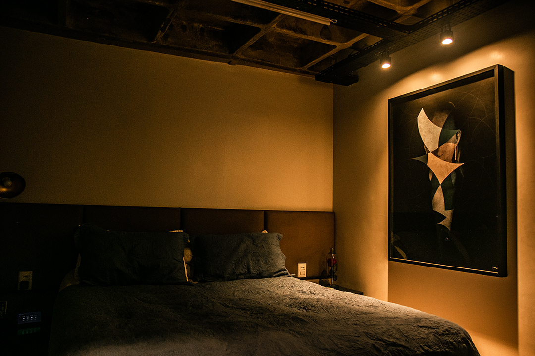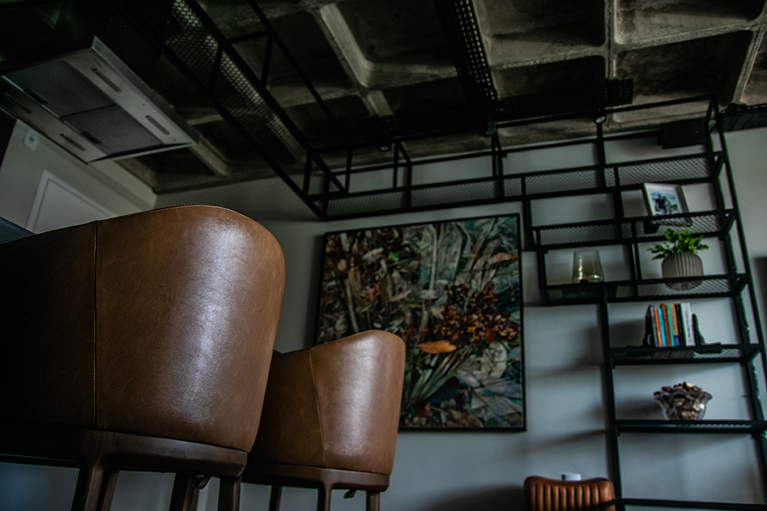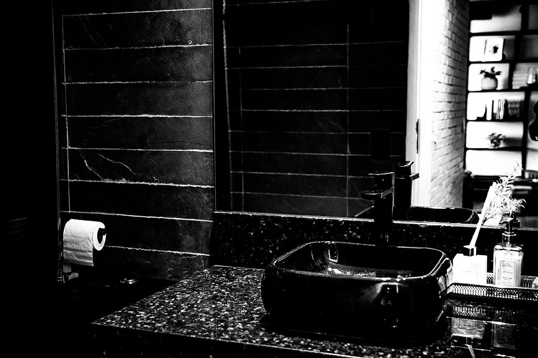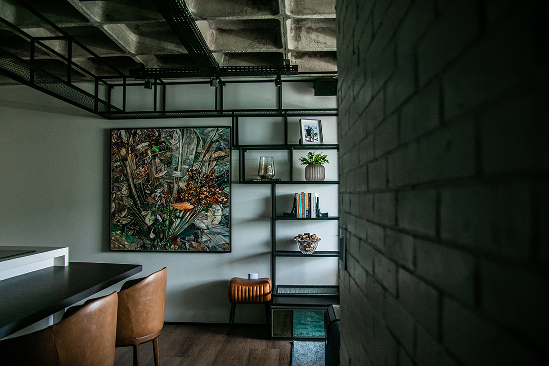 Os acabamentos acompanham essa narrativa: o piso de todos os ambientes foi substituído por paviflex de madeira, dialogando com a textura robusta da laje. Nas áreas molhadas, o uso da pedra ardósia filetada imprime autenticidade e caráter ao espaço. Como contraponto visual, a sala ganhou um revestimento de tijolinho pintado de branco, agregando textura sem competir com o concreto exposto.