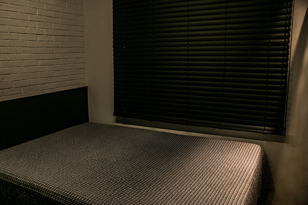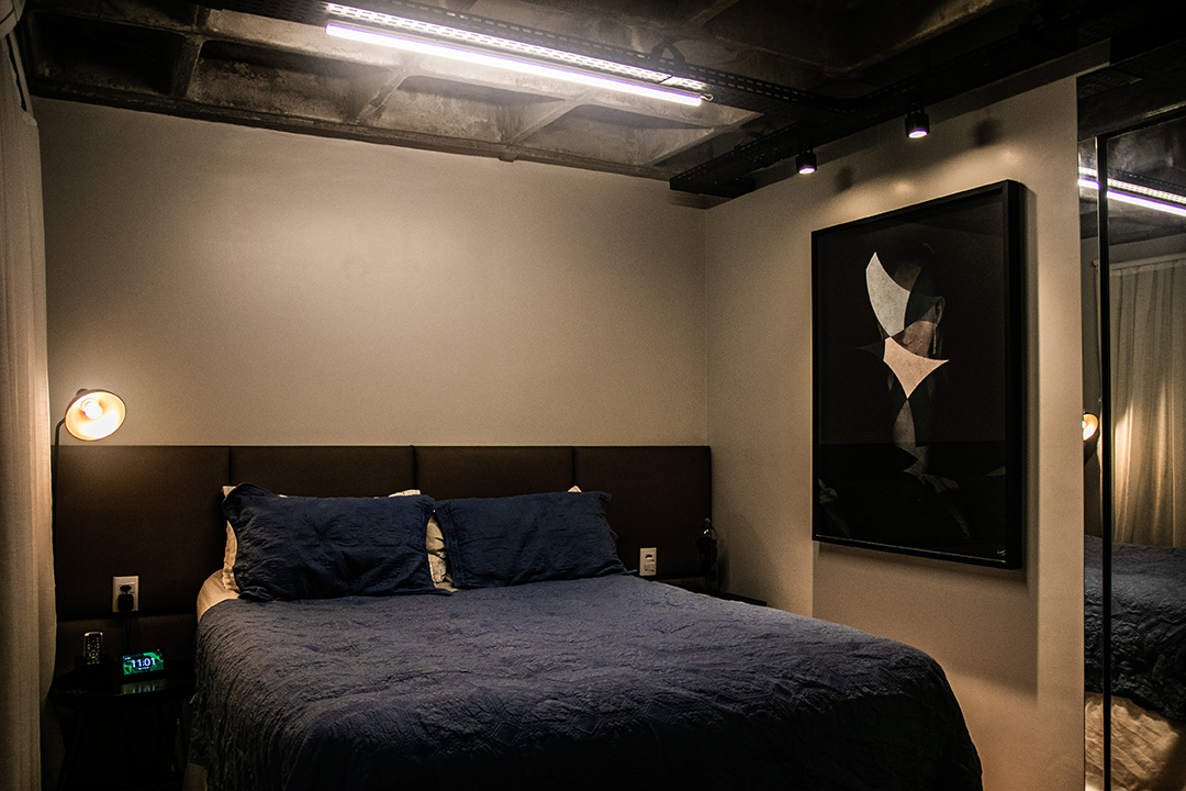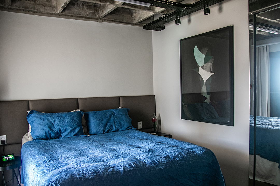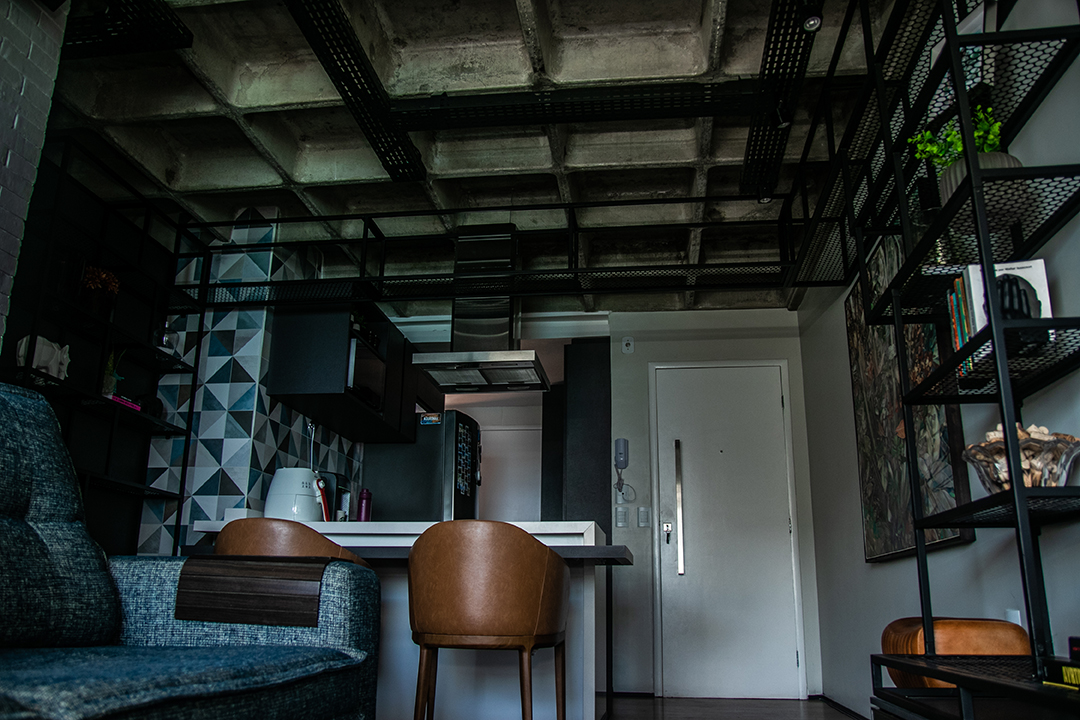 Também foi removida a parede que criava um corredor entre a sala e os quartos, contribuindo ainda mais para a sensação de espaço contínuo e descomplicado. Para potencializar esse efeito, o forro de gesso foi retirado, revelando o belo concreto nervurado da laje original do edifício. A escolha de preservar essa estrutura aparente reforça o conceito de materialidade e imprime identidade ao projeto.