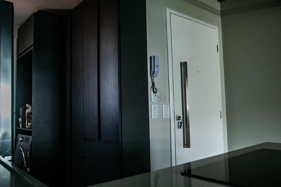 Para otimizar o uso da cozinha, as instalações hidrossanitárias foram completamente reorganizadas, promovendo um fluxo mais eficiente e funcional. Outra mudança impactante foi a retirada da parede e da porta que isolavam a varanda da sala. Com isso, a área social foi ampliada, e uma pele de vidro foi instalada, permitindo climatizar todo o espaço quando desejado — sem perder a conexão com o exterior.