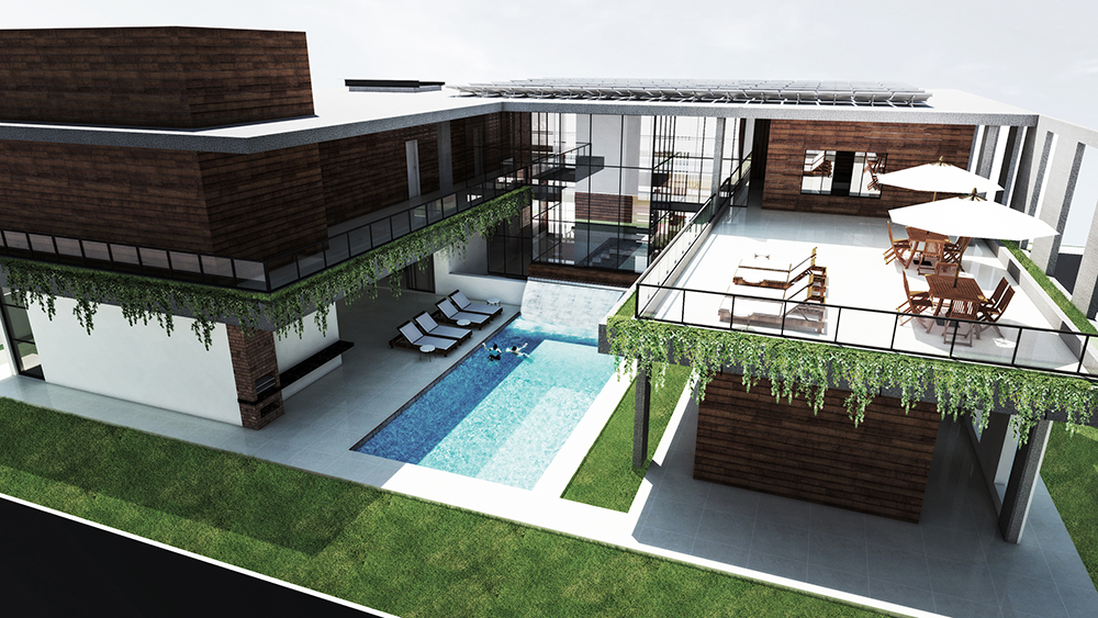 O programa contempla uma diversidade de ambientes que atendem tanto às atividades cotidianas quanto ao lazer e ao trabalho: sala de estar com adega integrada, sala de jantar, lavabo, cozinha, depósito, área de serviço, três suítes de serviço, dois escritórios e um estúdio musical com sala de produção. Na área íntima, a residência dispõe de cinco suítes com closet, além de uma suíte principal com dois closets, dois banheiros e varanda privativa. Todas as suítes possuem varandas, reforçando a conexão com o exterior e ampliando a ventilação cruzada.