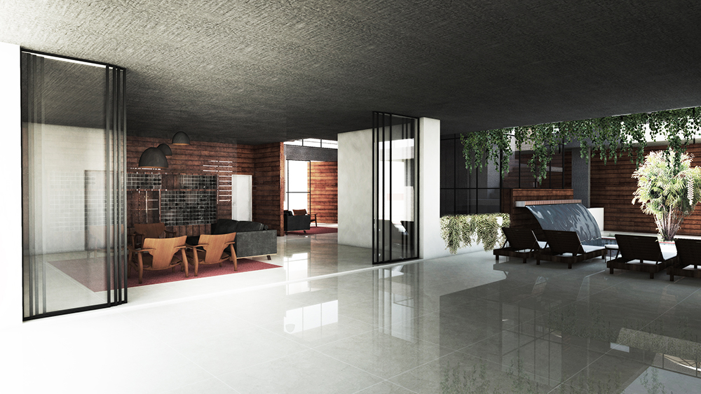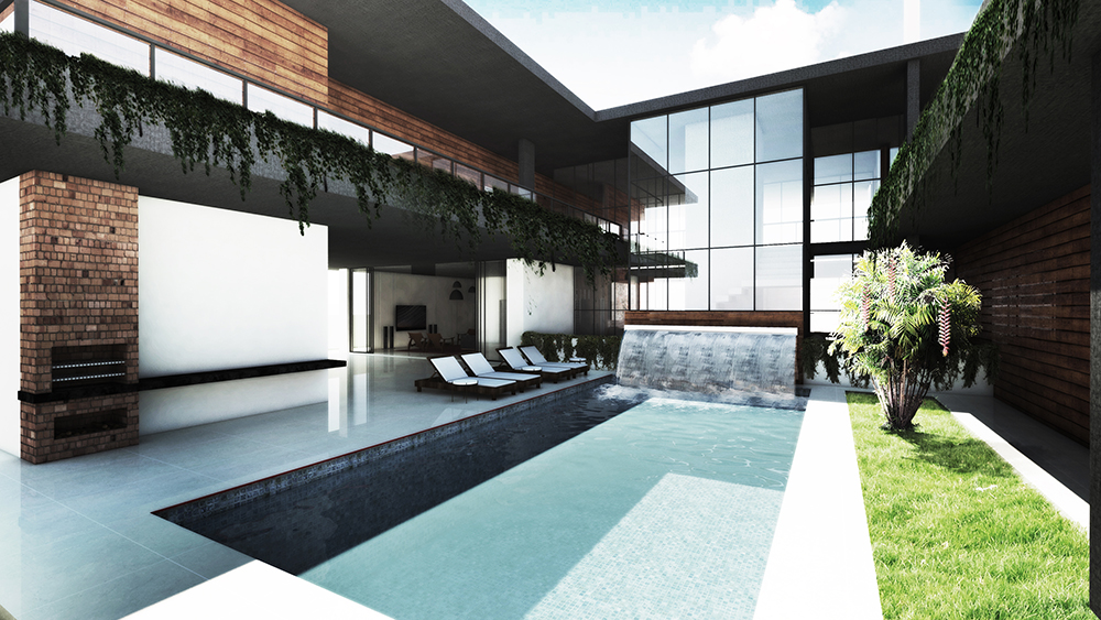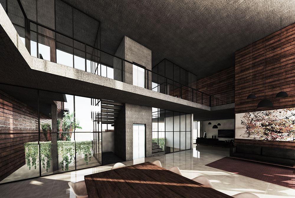 Um elemento de destaque é o sistema de ventilação natural do subsolo, viabilizado por meio de um jardim que se estende verticalmente até emergir junto à área da piscina. Esse recurso não apenas favorece a renovação do ar, mas também integra visualmente os diferentes níveis da residência. A circulação vertical — composta pelo elevador e pela escada — é envolvida por esse vazio ajardinado, criando uma experiência espacial marcada pela presença constante da vegetação e da luz natural.