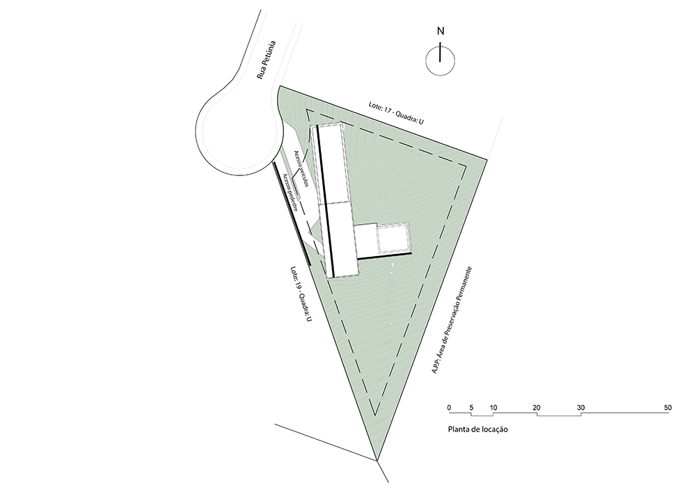 O projeto da Residência São José dos Campos, localizado no Recanto Santa Bárbara, à Rua Petúnia, Quadra U, Lote 18, em São José dos Campos, parte de uma leitura atenta das condicionantes físicas do terreno para a definição de seu partido arquitetônico. Com área de 2.077,45 m², o lote apresenta formato triangular e um desnível aproximado de 10 metros, características que se mostraram determinantes na implantação e na organização espacial da edificação.