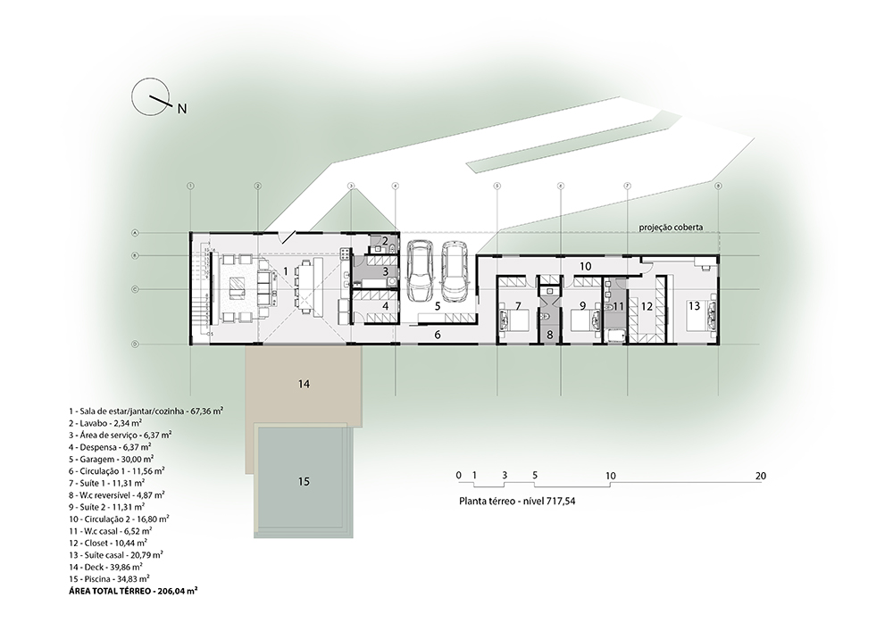 A residência, com área construída de 257,64 m², distribui-se em dois pavimentos e se desenvolve de forma linear, acompanhando as curvas de nível na porção mais elevada do terreno, próxima ao acesso viário. Essa estratégia minimiza movimentações de terra, preserva a topografia natural e favorece a relação visual com a paisagem, ao mesmo tempo em que garante maior domínio e controle sobre o acesso.
