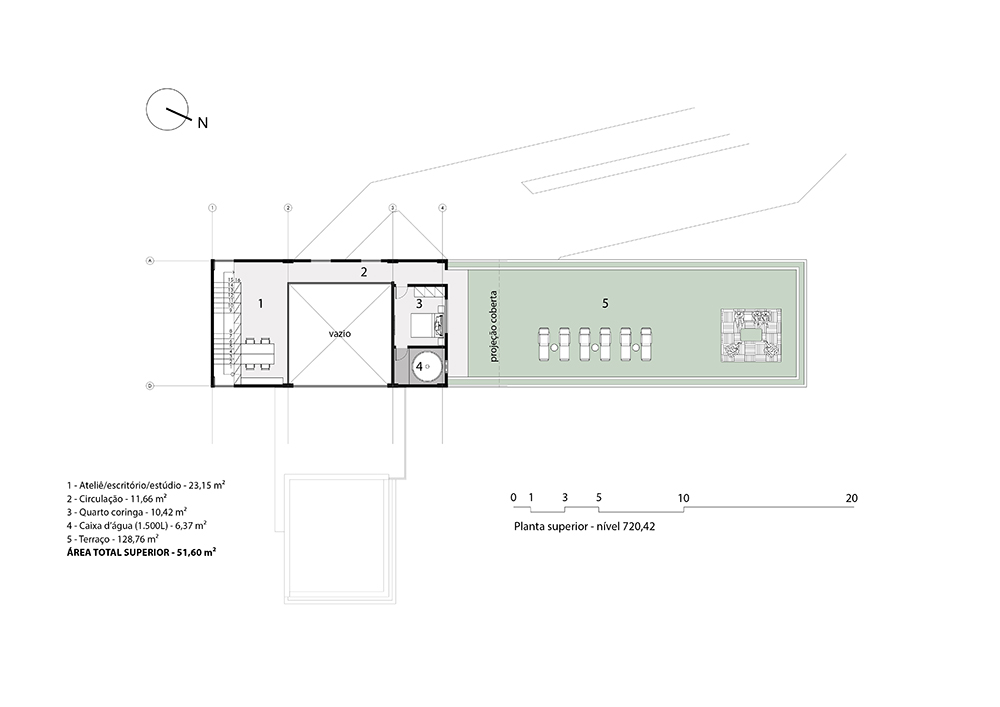 Como complemento às estratégias de conforto e uso, propõe-se a criação de um terraço-jardim sobre parte da cobertura do pavimento térreo. Esse espaço amplia as áreas de convivência ao ar livre e permite a fruição dos períodos de maior insolação, estabelecendo uma relação direta entre arquitetura e clima, além de contribuir para o desempenho térmico da edificação.