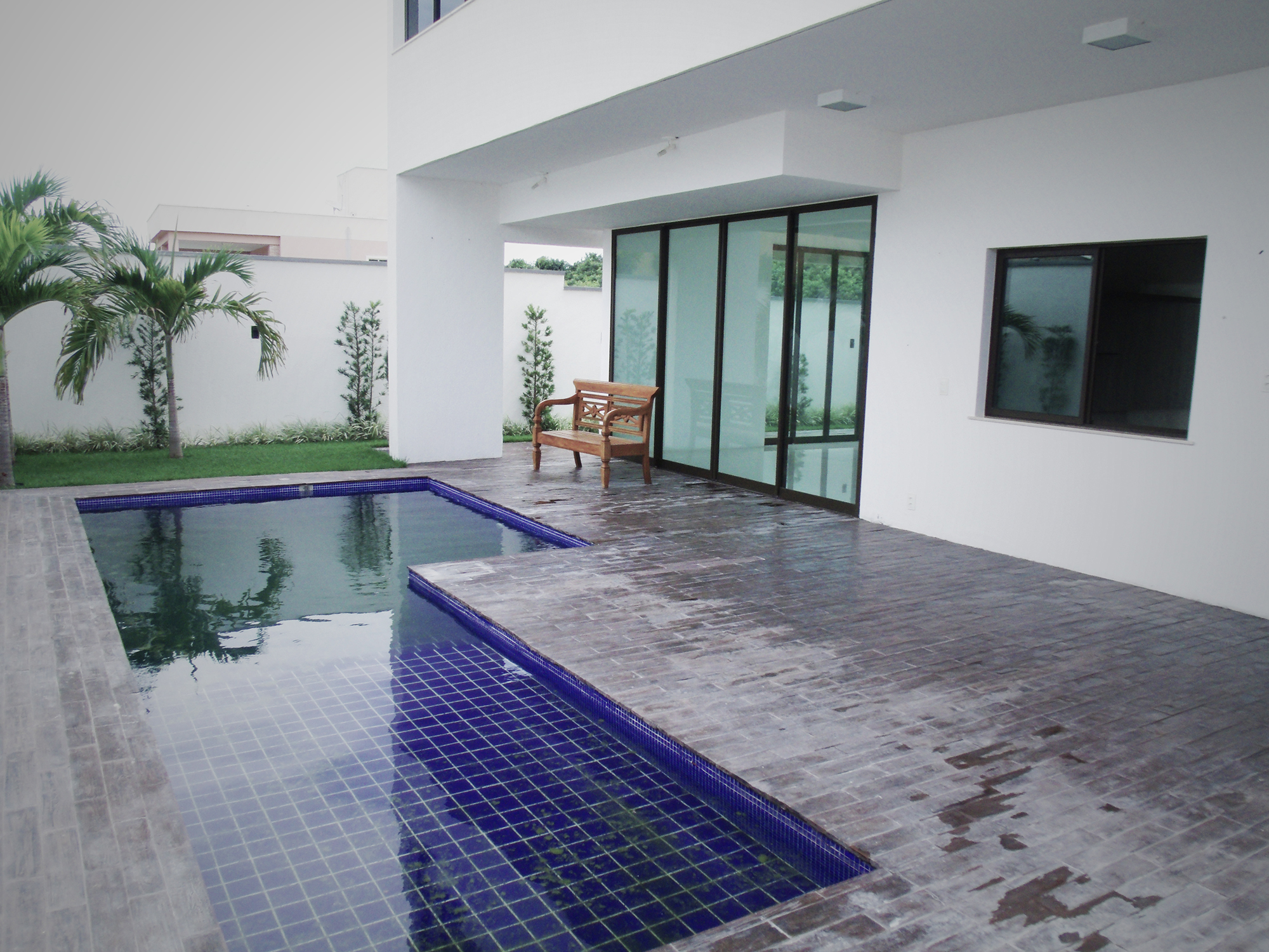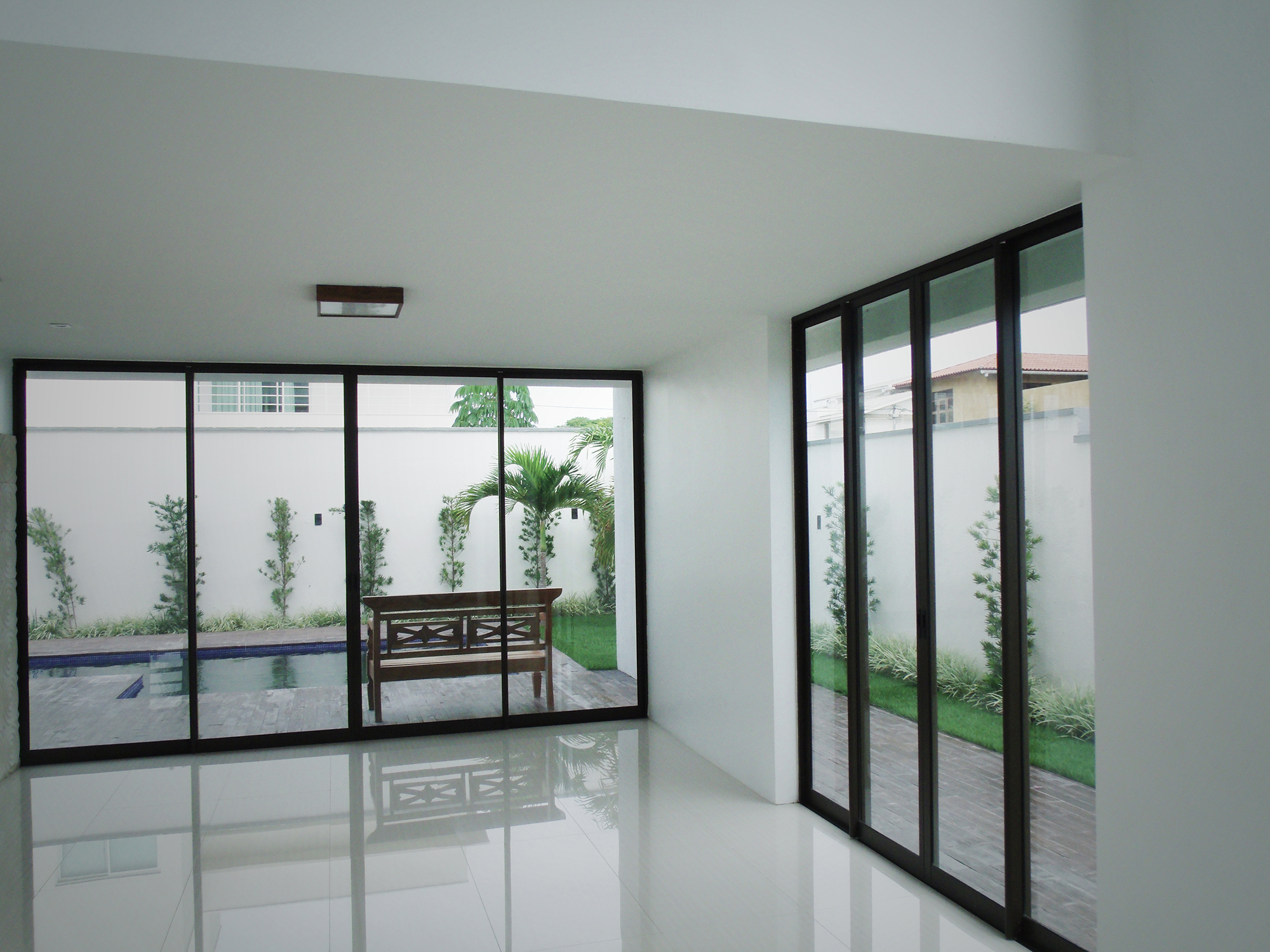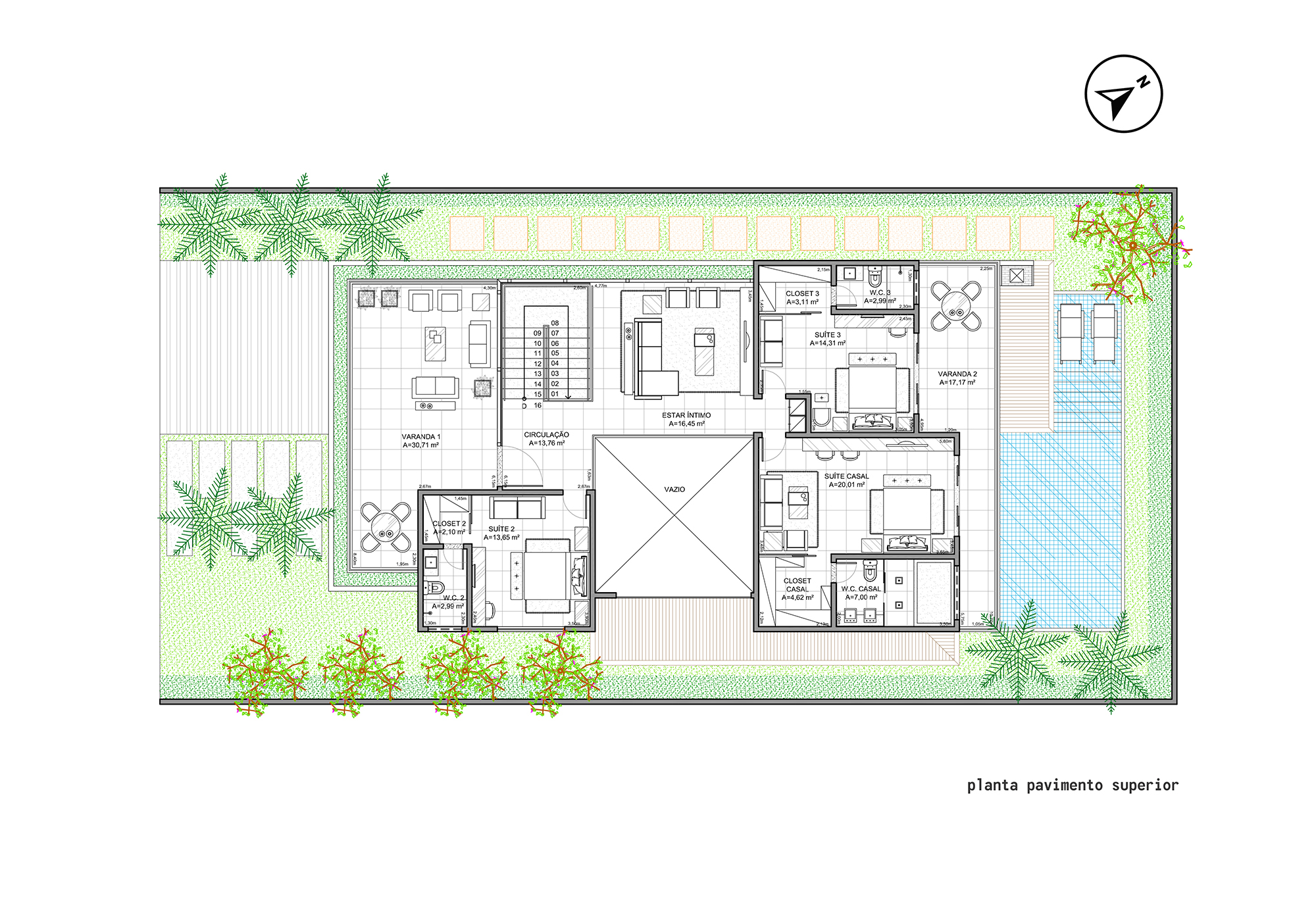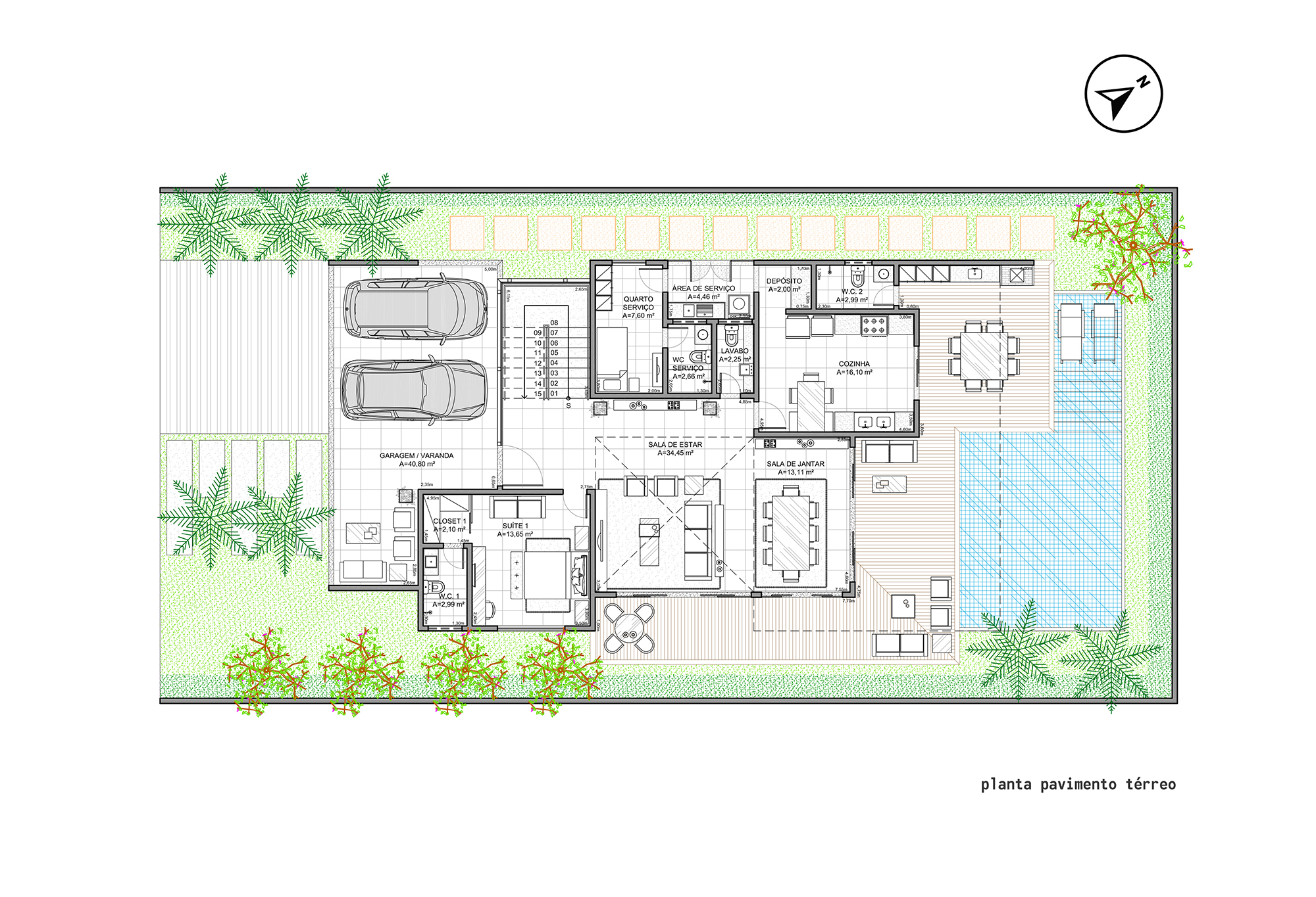 O programa é composto por 4 vagas de garagem, 5 suítes com closet, sala de estar e jantar integradas, lavabo, cozinha, área de serviço, depósito, deck, banheiro externo e piscina. A disposição dos ambientes prioriza a amplitude, a circulação fluida e a versatilidade, permitindo que a casa se adapte às diferentes fases da vida dos moradores.