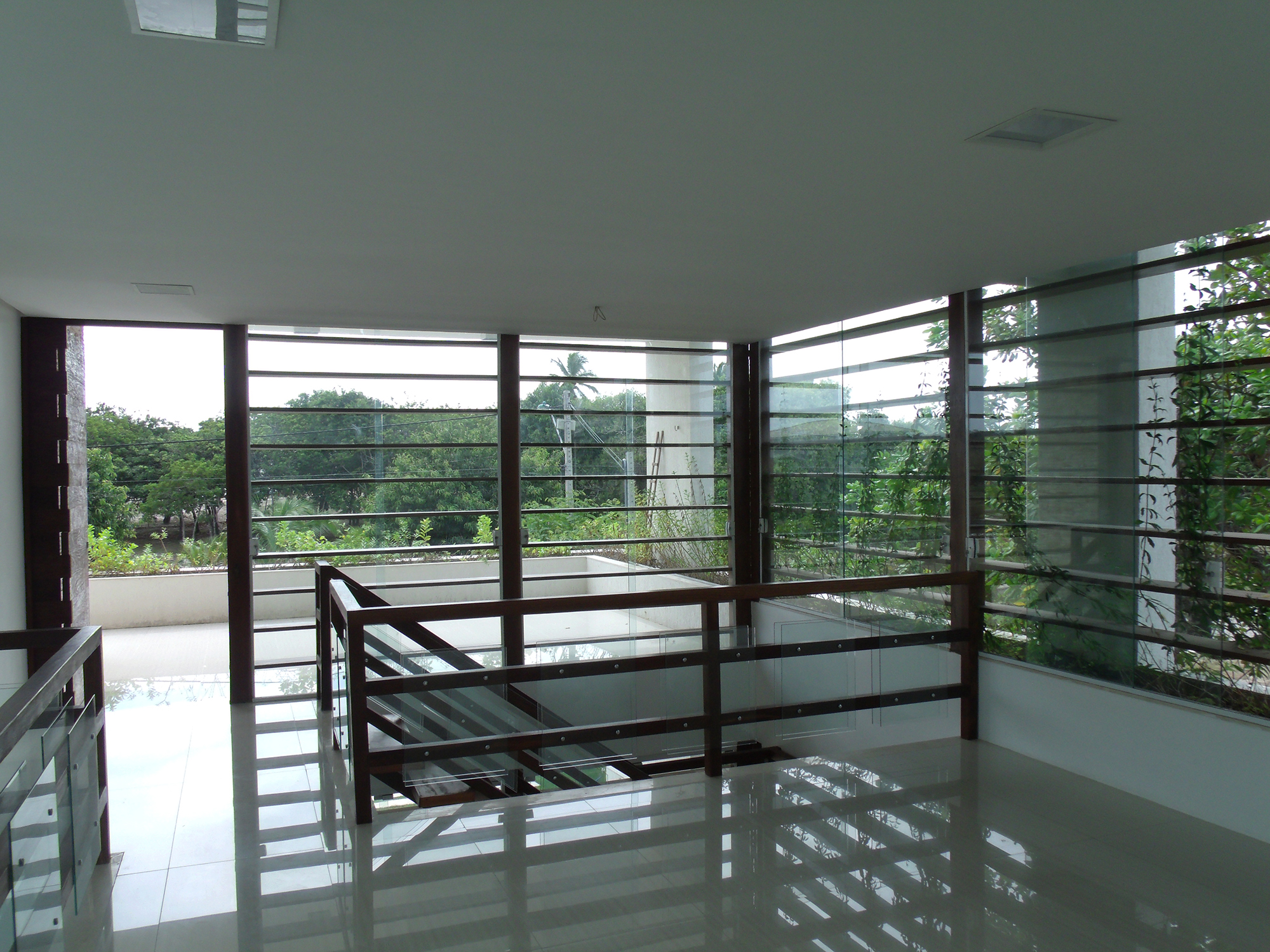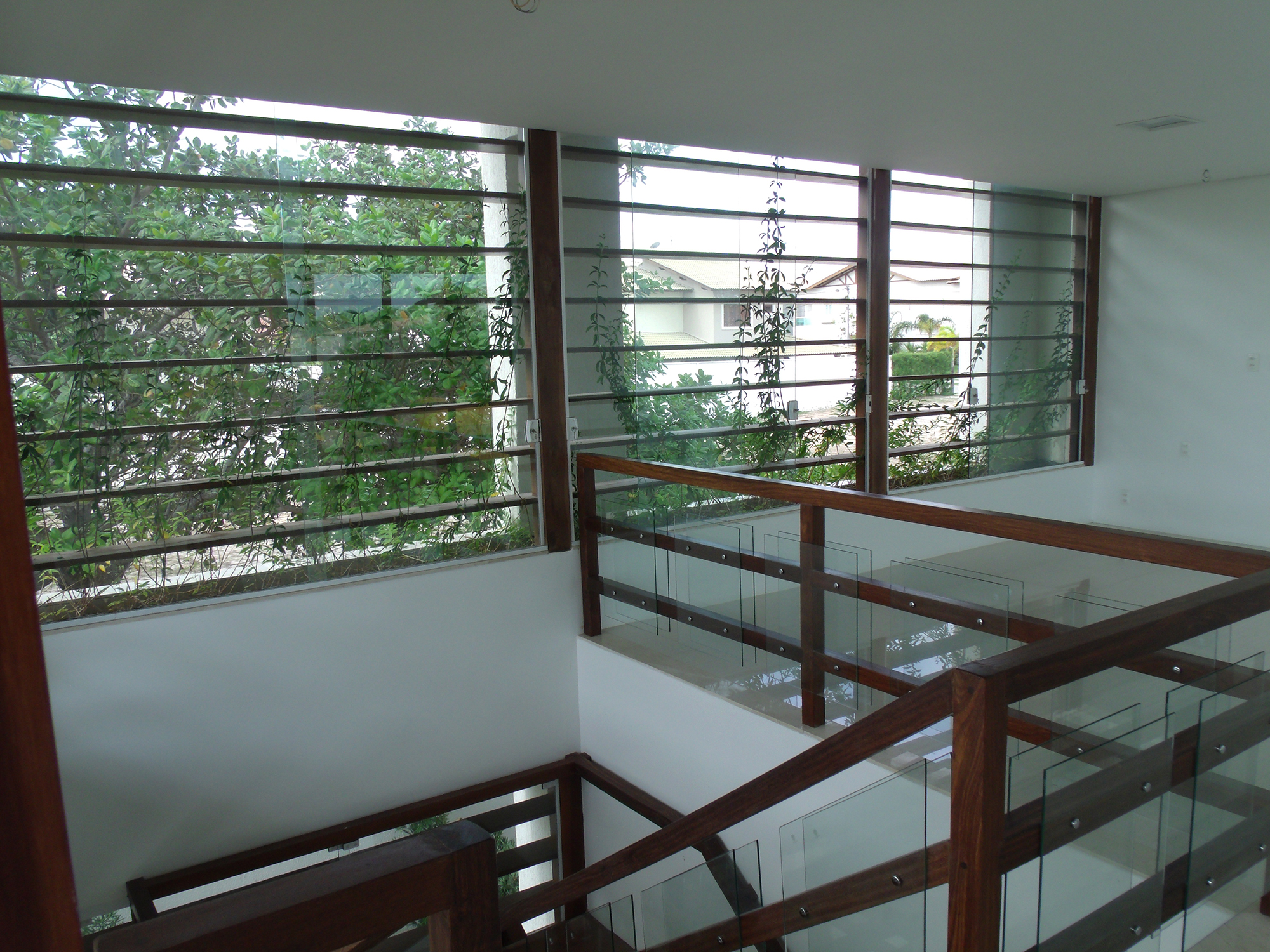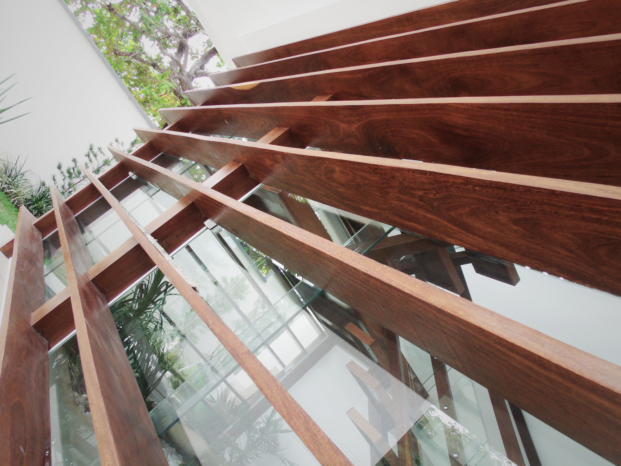A implantação no lote também responde às questões climáticas locais. Na fachada oeste, de maior incidência solar, foram posicionados ambientes de baixa permanência, como banheiros, depósito e área de serviço, funcionando como uma barreira térmica. Além disso, foram instalados brises horizontais que se estendem da fachada oeste até a fachada norte (principal), protegendo a pele de vidro que envolve uma escada escultórica em madeira, que conecta os dois pavimentos da residência. Esse elemento, além de funcional, reforça a integração visual com a natureza e cria um jogo de luz e sombra ao longo do dia.