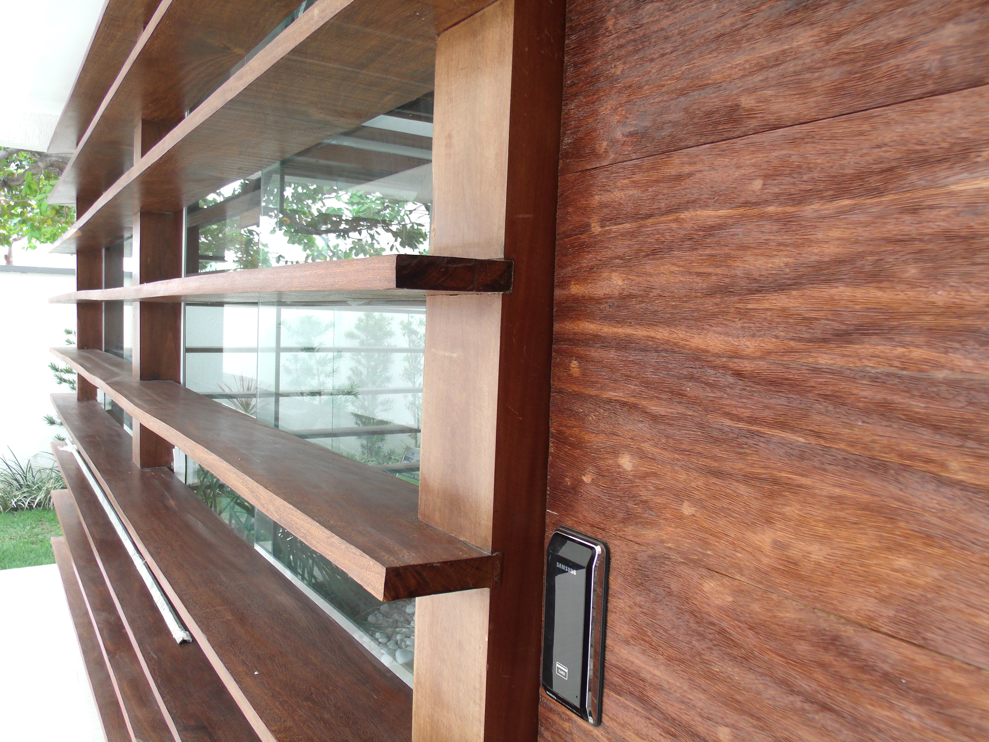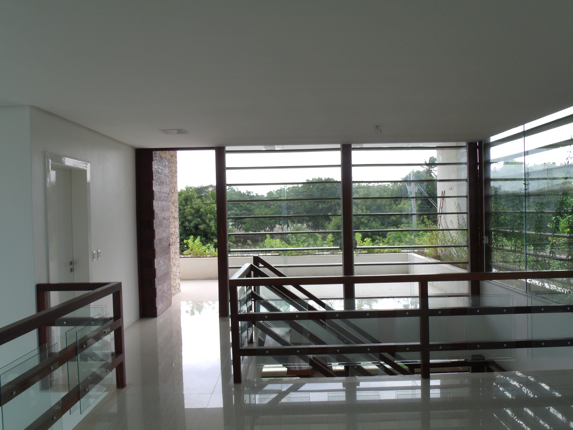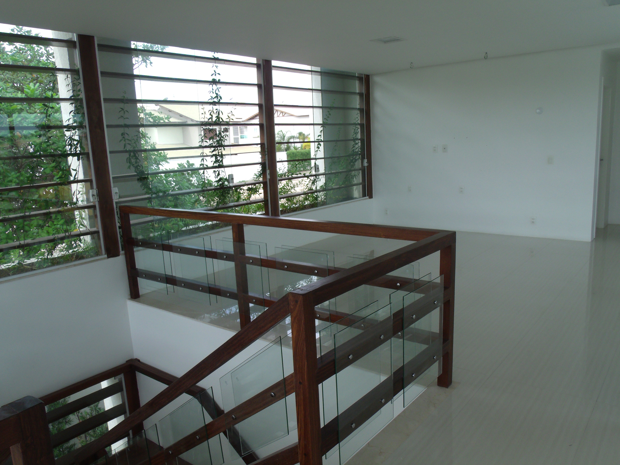 A implantação no lote também responde às questões climáticas locais. Na fachada oeste, de maior incidência solar, foram posicionados ambientes de baixa permanência, como banheiros, depósito e área de serviço, funcionando como uma barreira térmica. Além disso, foram instalados brises horizontais que se estendem da fachada oeste até a fachada norte (principal), protegendo a pele de vidro que envolve uma escada escultórica em madeira, que conecta os dois pavimentos da residência. Esse elemento, além de funcional, reforça a integração visual com a natureza e cria um jogo de luz e sombra ao longo do dia.