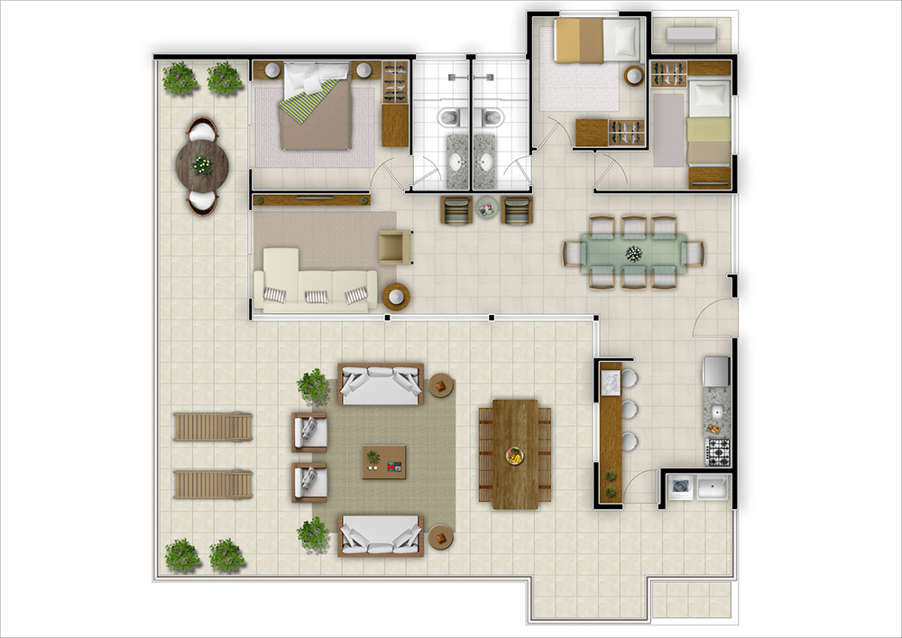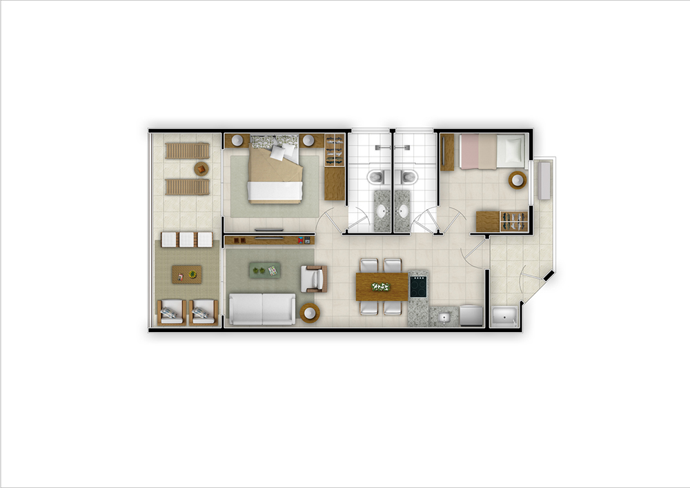 A área de lazer desenvolve-se ao longo de um eixo central entre os dois blocos residenciais, estruturando-se de forma sequencial e articulada. A partir do acesso principal, em um nível inicial, o projeto conduz o usuário a um segundo patamar onde se localiza o restaurante, que se integra à piscina, ao bar e aos demais equipamentos de convivência, como salões de festas e jogos, home theater, espaço zen, guarderia e brinquedoteca. Essa organização espacial promove uma experiência contínua de uso, incentivando a permanência e o convívio.