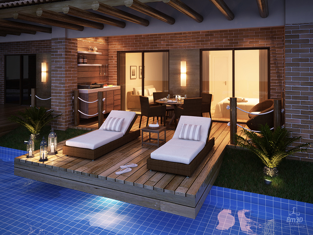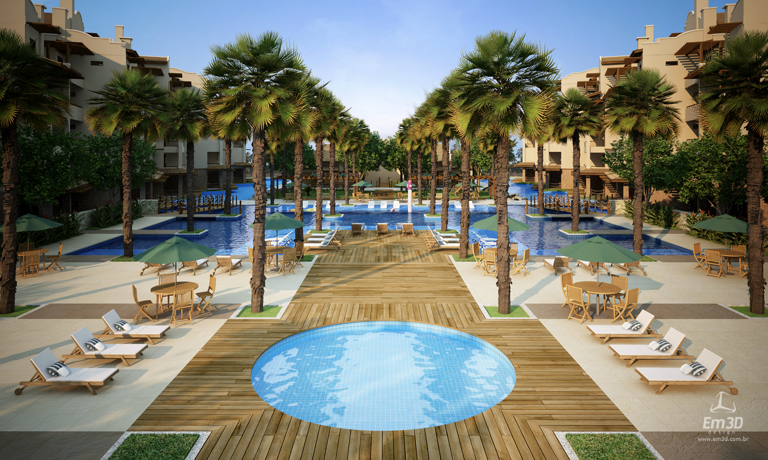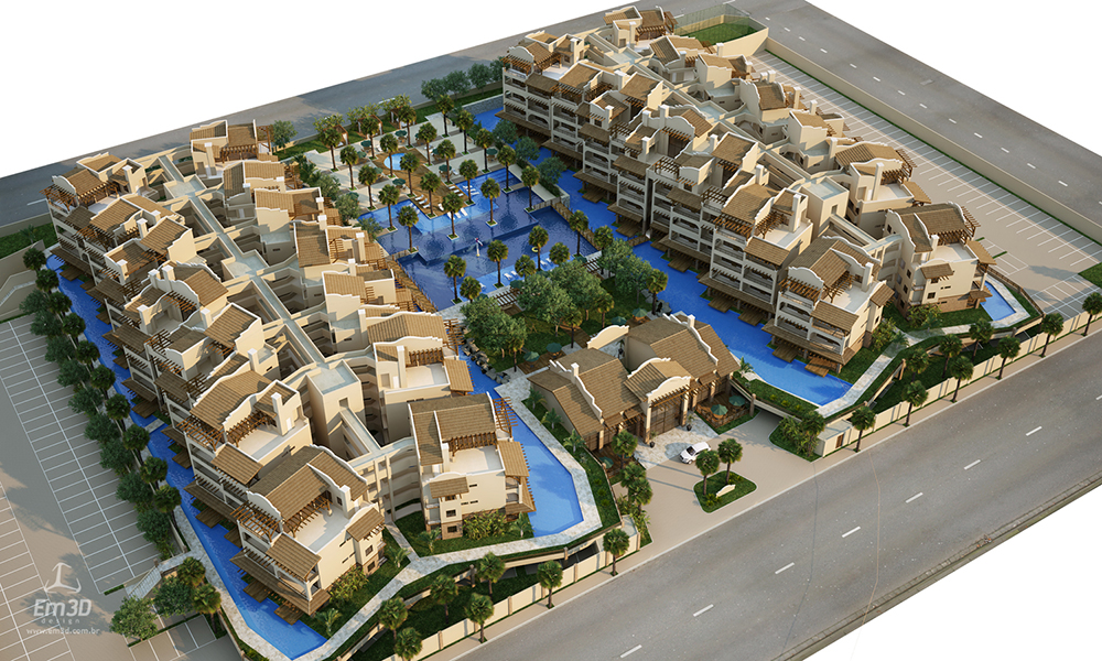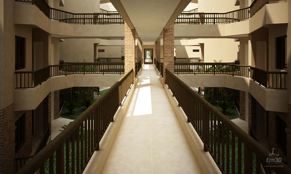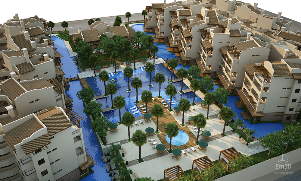 A concepção do projeto também responde a questões recorrentes observadas na comercialização de unidades habitacionais desse tipo. Tradicionalmente, apartamentos de pavimentos intermediários apresentam maior liquidez, enquanto unidades térreas sofrem com a falta de privacidade e coberturas enfrentam limitações de acesso. Para mitigar essas condições, foram adotadas soluções específicas: a implantação de elevadores, associados às escadas distribuídas ao longo dos blocos, assegura maior acessibilidade às unidades superiores; já os apartamentos térreos foram qualificados por meio da criação de espelhos d’água integrados à piscina principal, configurando uma ambiência em que os blocos residenciais se comportam como “ilhas”. Essa estratégia reduz o fluxo direto de usuários das áreas comuns junto às unidades térreas, ampliando sua privacidade, ao mesmo tempo em que possibilita a incorporação de pequenos píeres privativos junto às varandas, criando um diferencial tipológico e comercial.