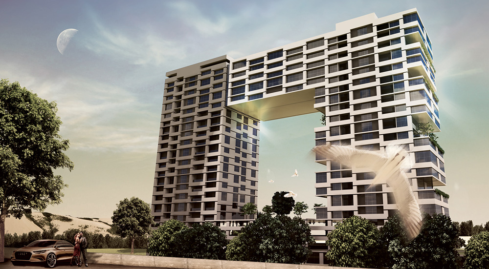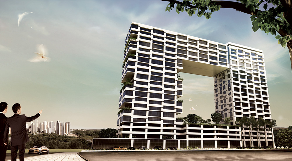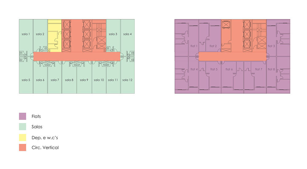 O conjunto edificado organiza-se em duas torres, conectadas nos pavimentos superiores. A torre frontal, mais exposta e visível a partir da avenida, é destinada ao uso comercial, composta por pavimentos tipo com 12 salas comerciais, variando entre 30,00 m² e 34,74 m² de área privativa. Nos níveis superiores, na região de conexão entre as torres, localizam-se salas corporativas de maior porte, com aproximadamente 353,99 m², destinadas a empresas que demandam espaços mais amplos e qualificados. Complementando essa infraestrutura, foi prevista a implantação de um heliponto, reforçando o caráter corporativo e a acessibilidade do empreendimento.