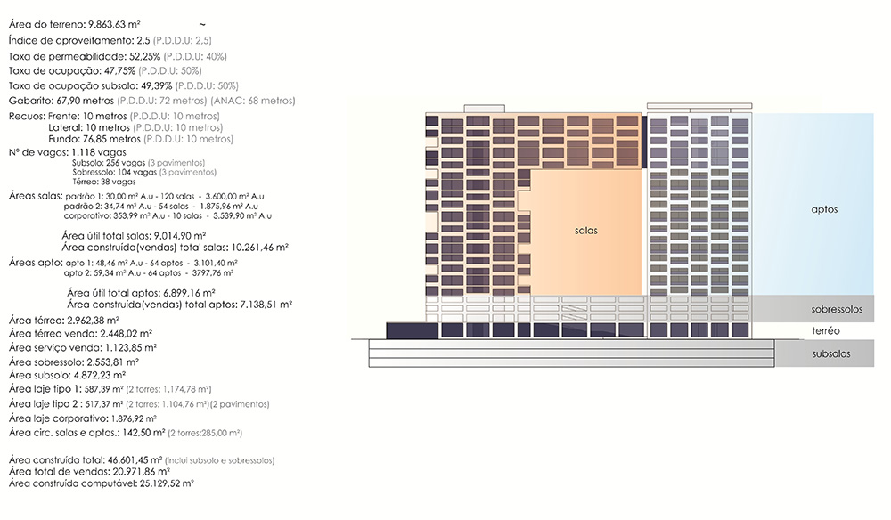 Com área construída total de 46.601,45 m², o edifício é concebido como um empreendimento de uso misto, classificado como Comércio e Serviços Múltiplos (CSM), reunindo funções corporativas, comerciais e residenciais em um único conjunto integrado. O principal desafio projetual consistiu em articular esses diferentes usos de forma fluida, eficiente e coerente com as demandas do mercado e as especificidades do terreno.