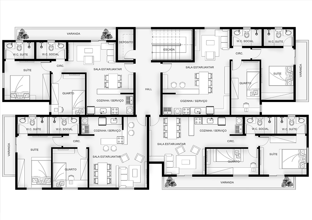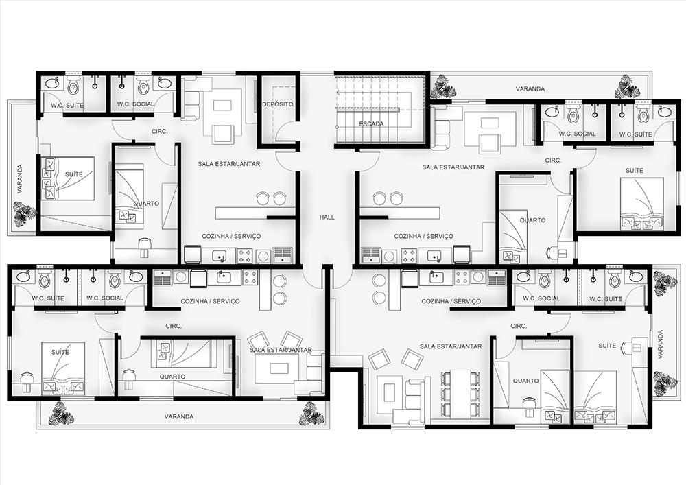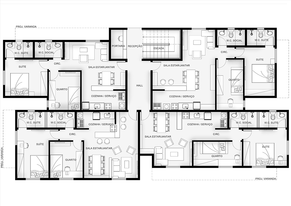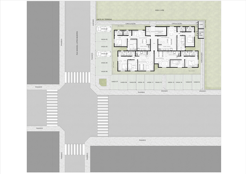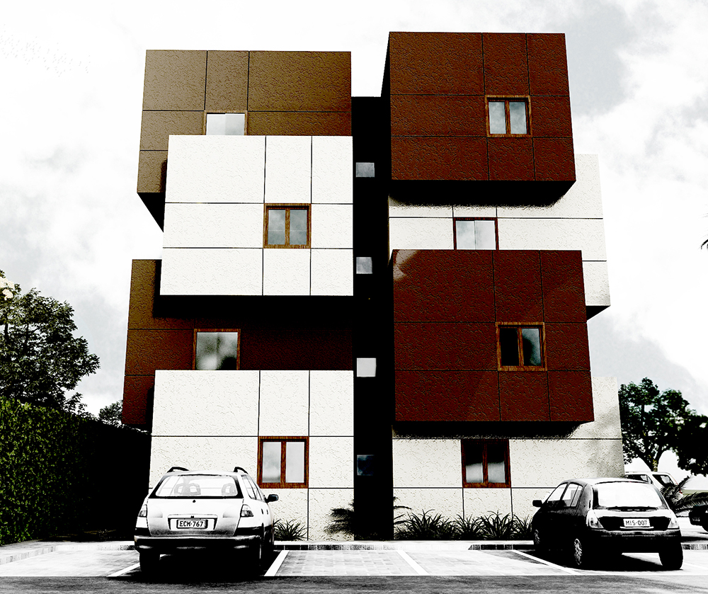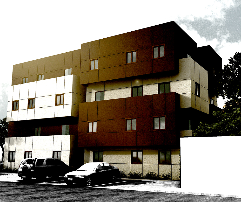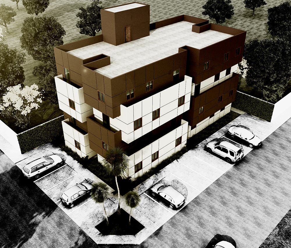 O objeto dos serviços refere-se à elaboração de Projeto de Arquitetura, de uma residência multifamiliar com 1.094,77 m² de área construída, com afastamentos de 5 metros nas duas frentes do lote, 1,50 metros na lateral e 1,50 metros no fundo. Toda a conceituação do projeto foi pensada nas exigências do cliente. Foi pensado numa edificação contemporânea com traços muito simples que refletisse a simplicidade e praticidade de viver. São 16 apartamentos que variam em área de 47,00 m² a 59,00 m² de área útil aproximadamente. Em cada pavimento temos 4 apartamentos inclusive no térreo, onde foi trabalhado uma portaria para receber seus moradores e possíveis visitantes. Temos uma escada que liga todos os pavimentos e um depósito em todos os andares para dar auxílio aos seus condôminos. Cada apartamento possui uma vaga de garagem, logo a edificação possui 16 vagas para veículos. Cada unidade habitacional possui uma cozinha, área de serviço, sala de estar/jantar, banheiro social, um quarto e uma suíte com ar condicionado. Uma característica conceitual do projeto é a presença das varandas em todos os apartamentos, varandas estas que ficam alternando em toda edificação tendo como resultado, uma volumetria ímpar em frente a outros edifícios do mesmo programa. O volume da edificação com linhas simples será todo revestido em textura com detalhes em perfil de alumínio, transmitindo assim o estilo arquitetônico solicitado pelo cliente.