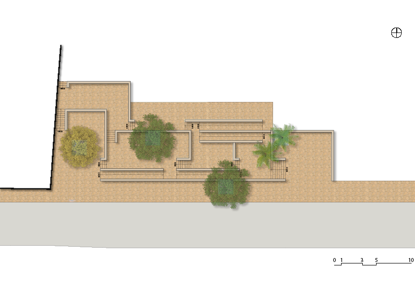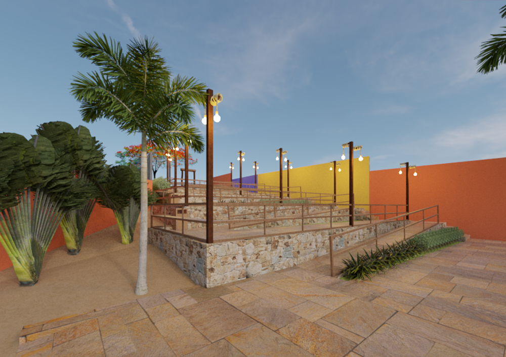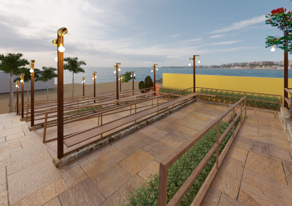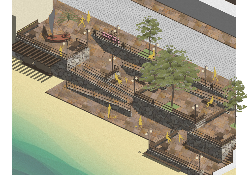 Paralelamente à questão identitária, a acessibilidade constitui diretriz fundamental do projeto. A significativa diferença de cotas entre as vias urbanas e a faixa de praia exigiu soluções cuidadosas que combinam escadas e rampas, garantindo o acesso seguro e inclusivo para diferentes perfis de usuários. O desenho desses percursos busca equilibrar funcionalidade e conforto, transformando o deslocamento em uma experiência gradual de aproximação com a paisagem.