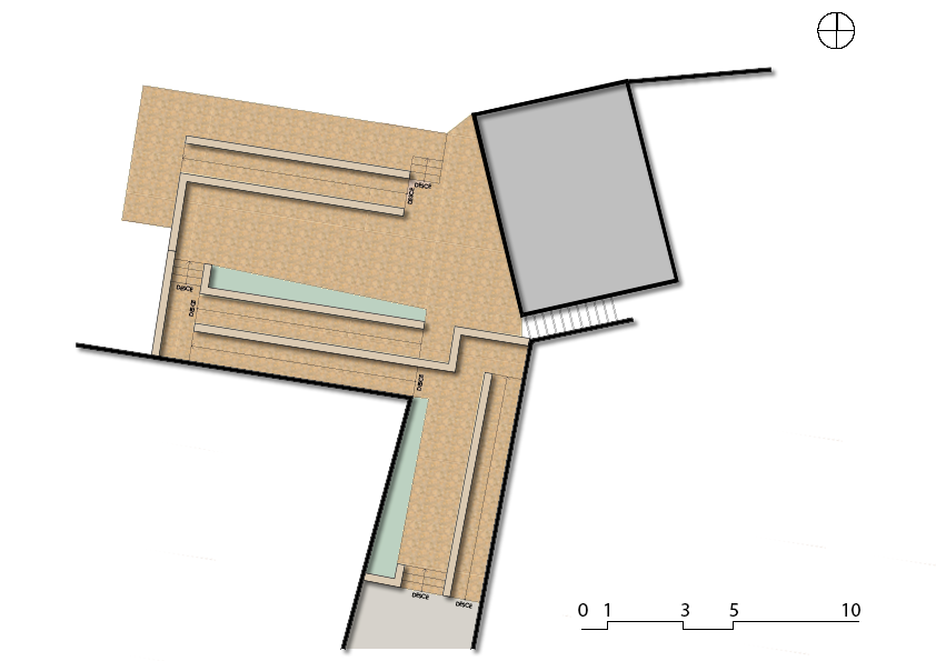 Entrada em “L”: caracterizada por sua configuração espacial e pela qualidade das visuais, esta entrada foi potencializada com a criação de um mirante. O ponto de observação valoriza a paisagem e transforma o percurso em um momento de contemplação.