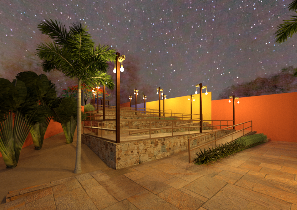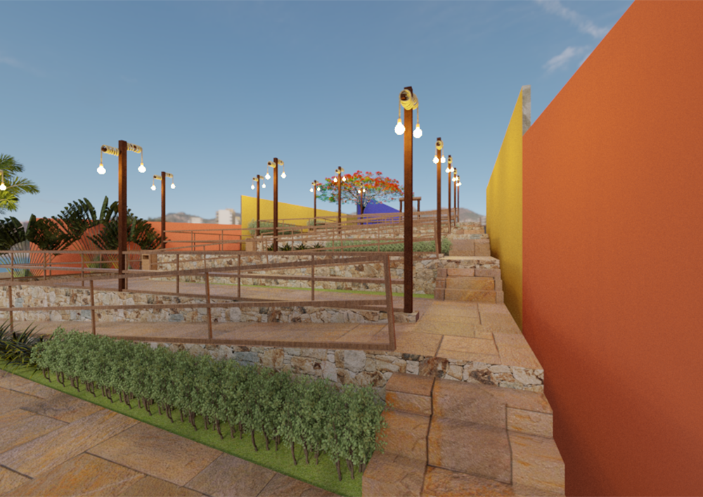 Entrada Escada-Rampa: marcada por sua topografia e vistas privilegiadas, esta entrada foi pensada como espaço de convivência, com áreas de permanência, bancos e pontos destinados ao registro fotográfico, explorando o potencial cênico do local.