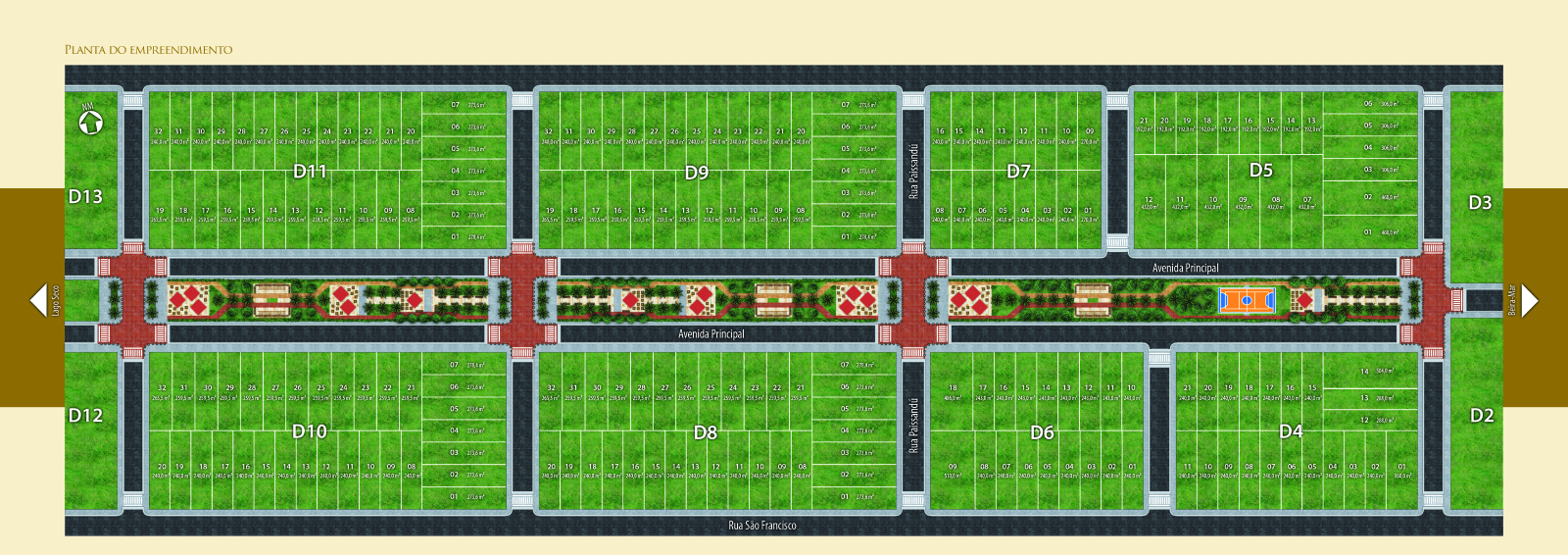 A organização dos lotes segue uma lógica de racionalidade e aproveitamento urbano, com dimensões de 8 metros de testada por 30 metros de profundidade nos miolos de quadra, e 13 metros de testada por 30 metros de profundidade nas esquinas, permitindo maior flexibilidade de implantação nas áreas de maior visibilidade.