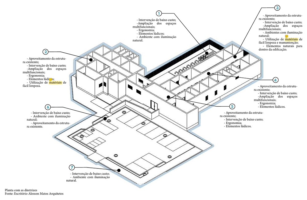 O processo de criação de um novo projeto para a unidade iniciou-se pela pontuação de diretrizes capazes de nortear as necessidades e pedidos do corpo técnico e pacientes, além de relacionar com conceitos e estratégias arquitetônicas, tais como: I. Aproveitamento da estrutura existente; II. Intervenção de baixo custo; III. Ampliação dos espaços multifuncionais; IV. Soluções viáveis de humanização; Utilização de materiais de fácil limpeza e manutenção; Ambientes com iluminação natural; Ergonomia; V. Elementos naturais para dentro da edificação; VI. Elementos lúdicos.