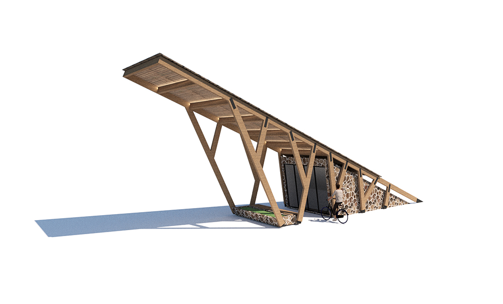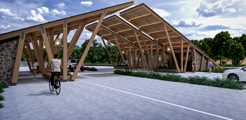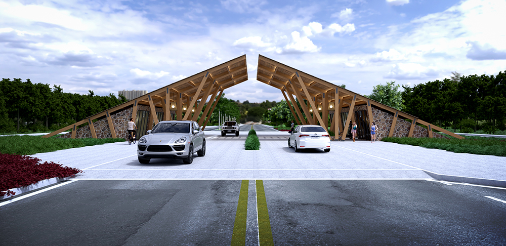 A linguagem arquitetônica do portal incorpora tais referências por meio de uma estrutura em madeira com cobertura em taubilha, inclinada a 40%, que se projeta sobre volumes em alvenaria revestidos em pedra fogo. A composição se organiza em dois elementos simétricos implantados em lados opostos da rodovia, estabelecendo um gesto de “portal” propriamente dito, que demarca a transição entre o território da estrada e o ambiente da praia.
