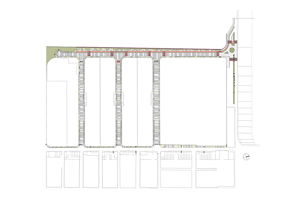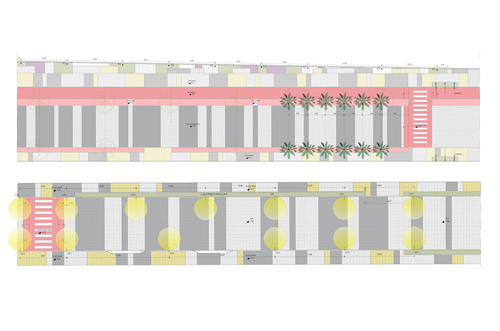 A topografia do terreno, levemente elevada em relação ao ponto de entrada, foi explorada como elemento projetual. Ao adentrar o empreendimento, o usuário passa a perceber o espaço a partir de uma cota superior, o que permitiu o desenvolvimento de uma paginação de piso rica e expressiva nas vias e passeios. Foram utilizados quatro tons de blocos intertravados — amarelo, cinza claro, cinza escuro e vermelho — este último destinado à ciclovia e às travessias elevadas de pedestres, reforçando a hierarquia dos fluxos e a segurança viária. O desenho resultante funciona como um grande tapete urbano, perceptível tanto na escala do pedestre quanto em visadas mais amplas.
