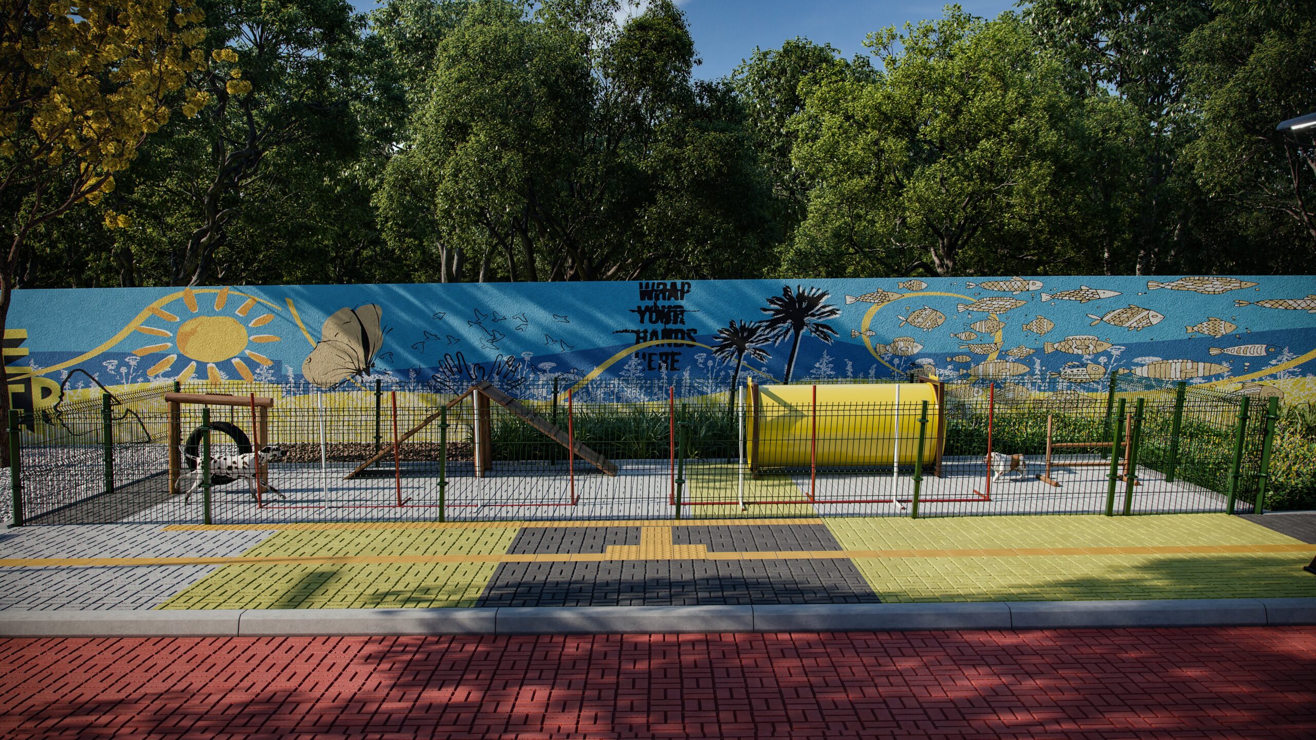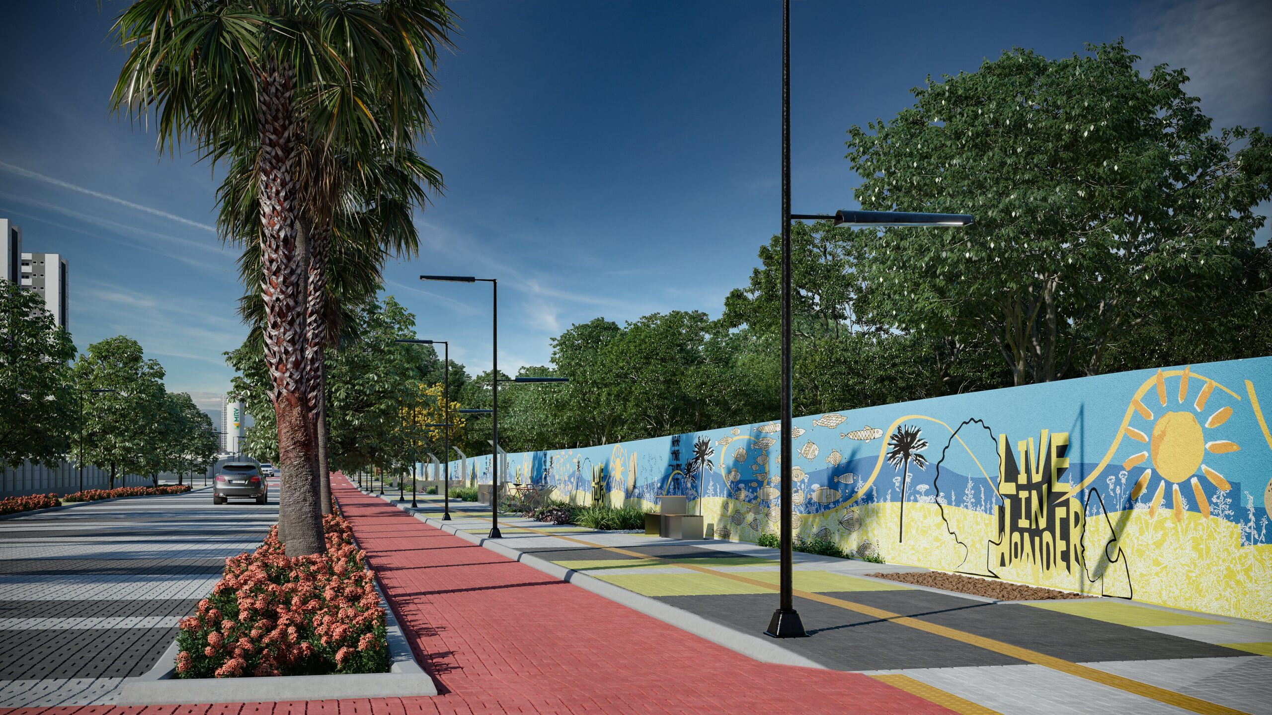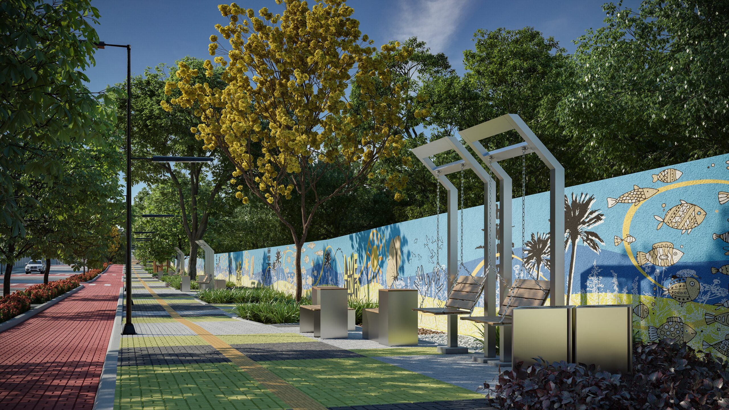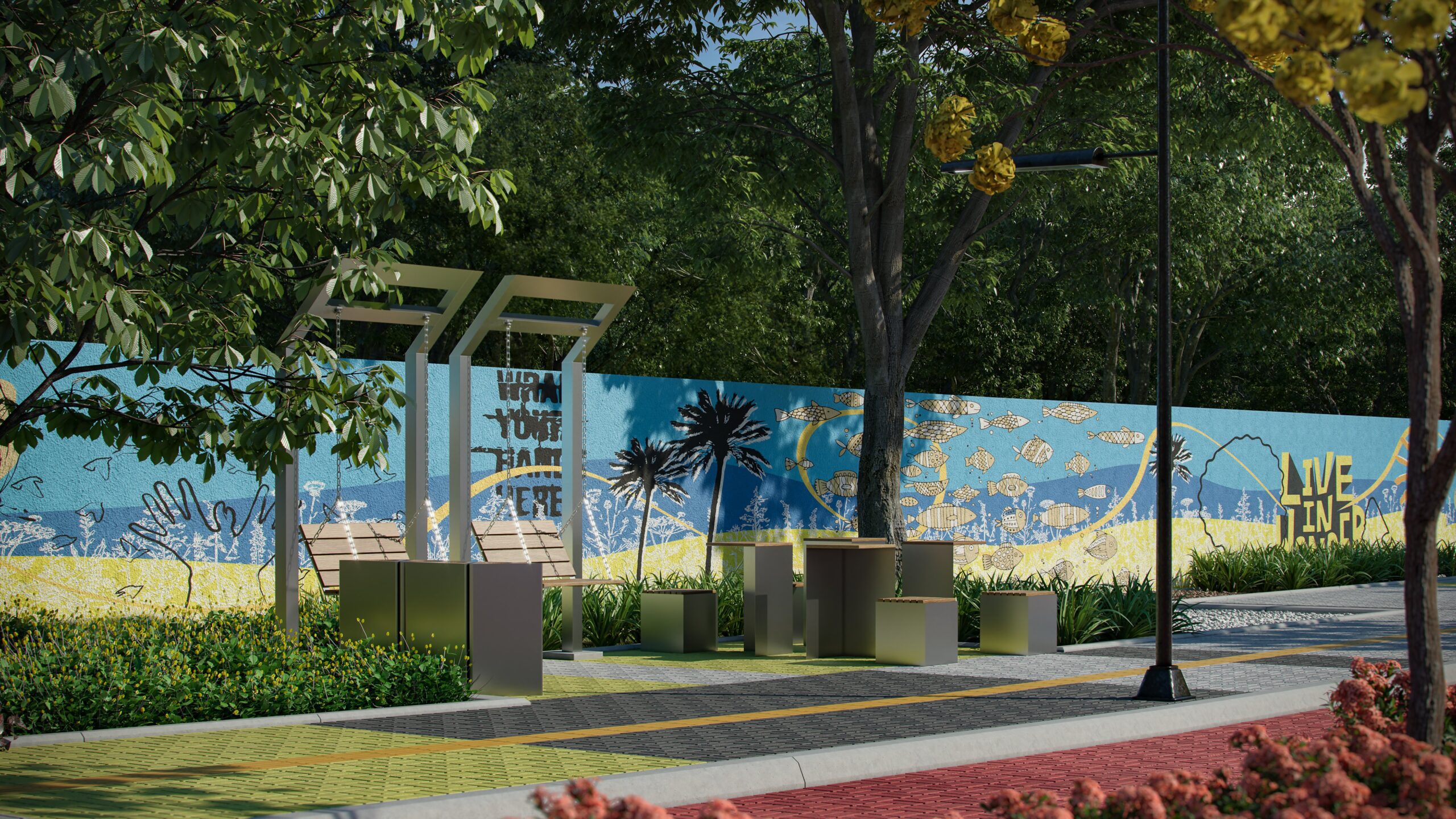 Como elemento de forte identidade cultural, o muro que delimita o parque recebe uma intervenção artística de grande escala, assinada pelo artista cearense Luz. A proposta consiste na representação da fauna do Parque do Cocó em dimensões monumentais, transformando o plano vertical em um suporte narrativo e educativo. Além de qualificar visualmente o espaço, o painel se configura como ponto de atração e interação, estimulando o registro e a permanência dos usuários.