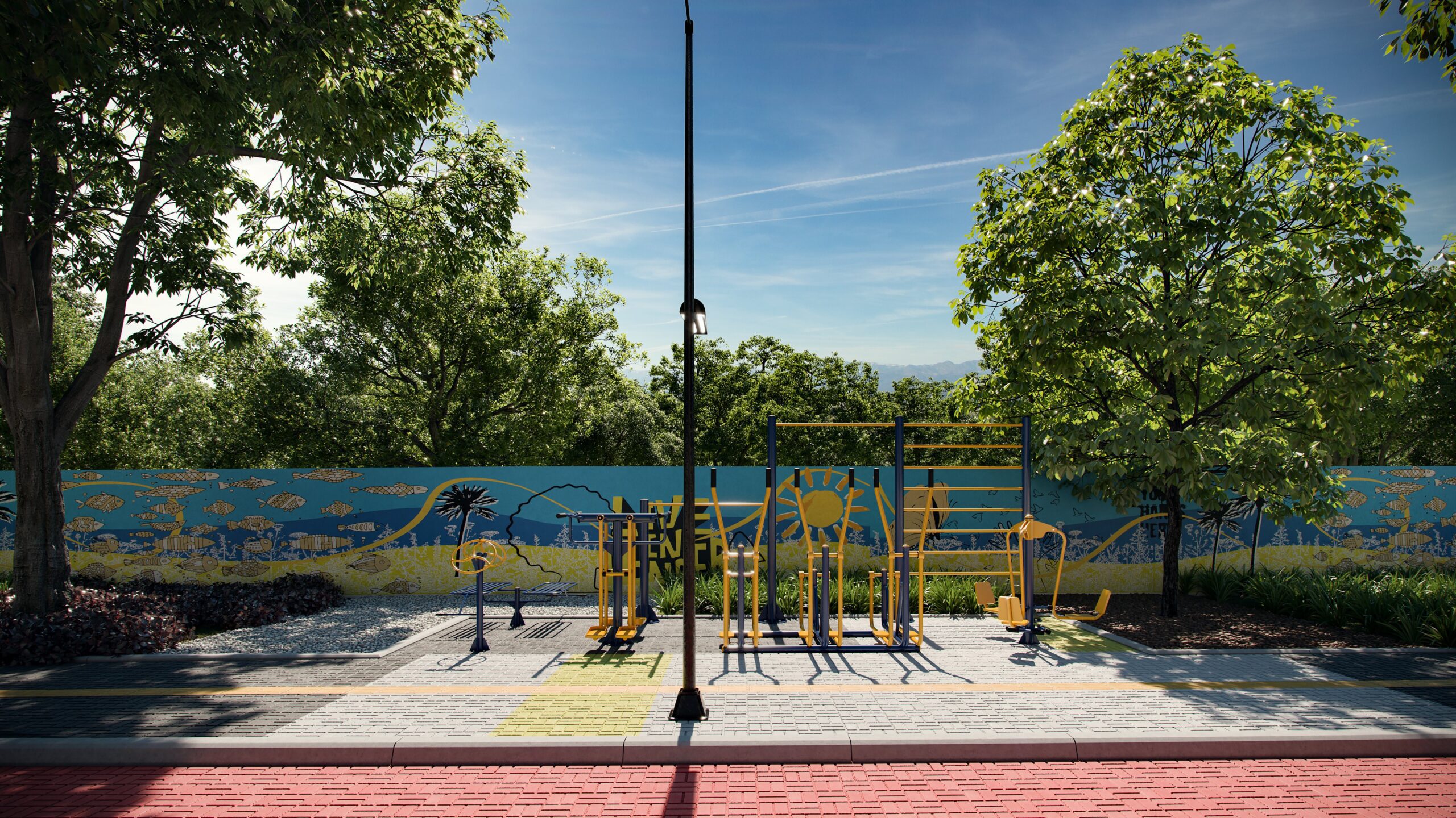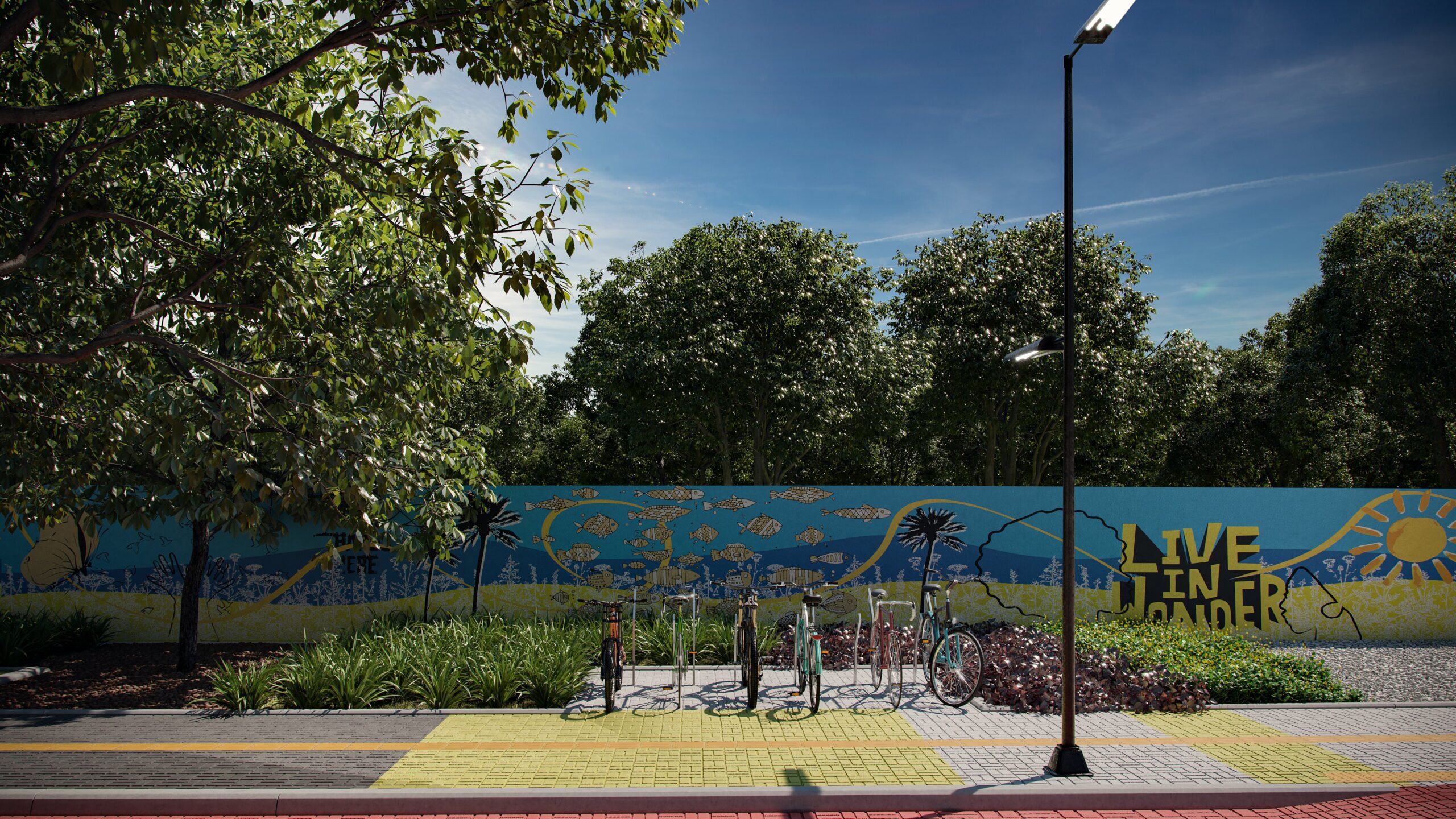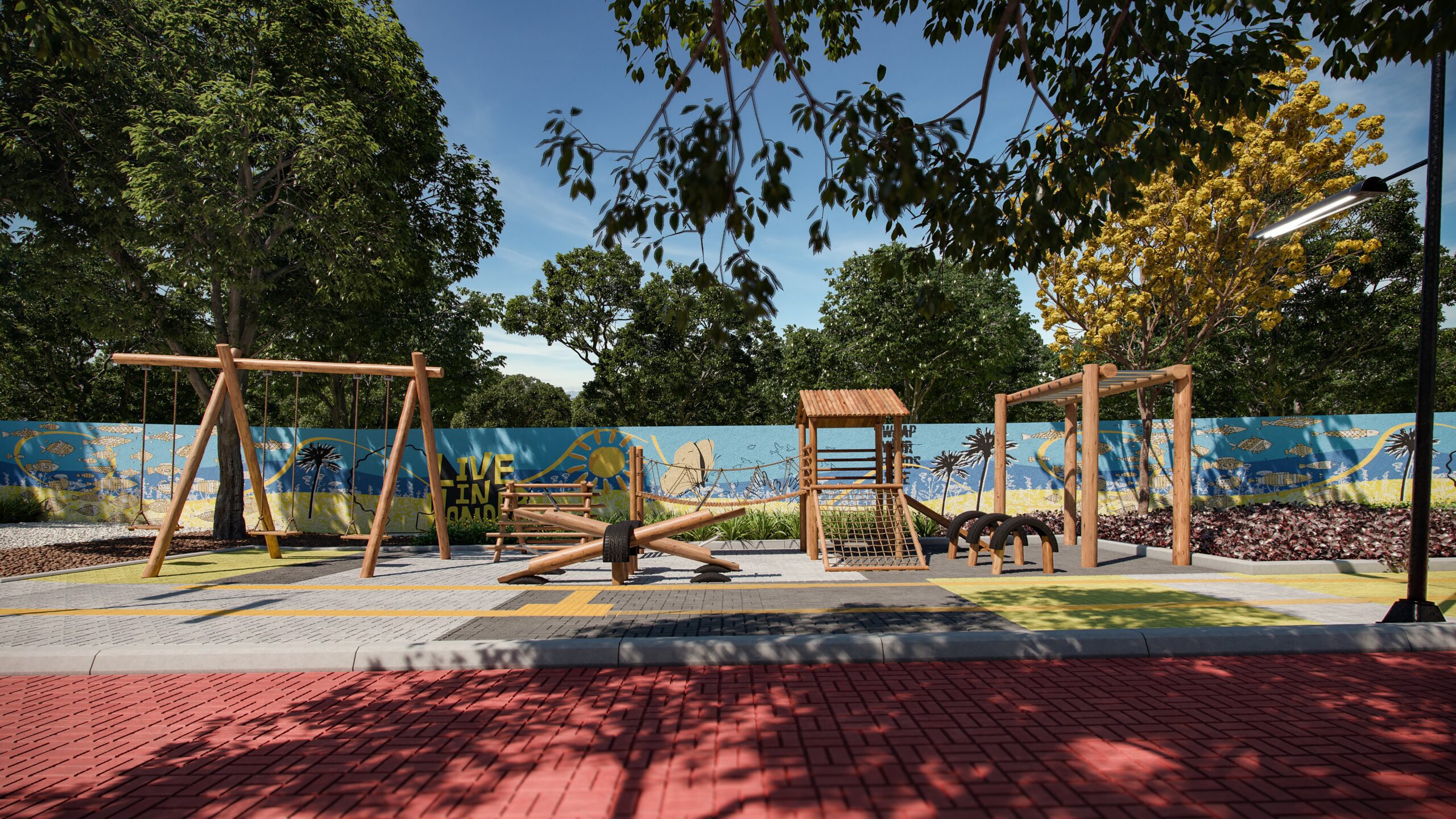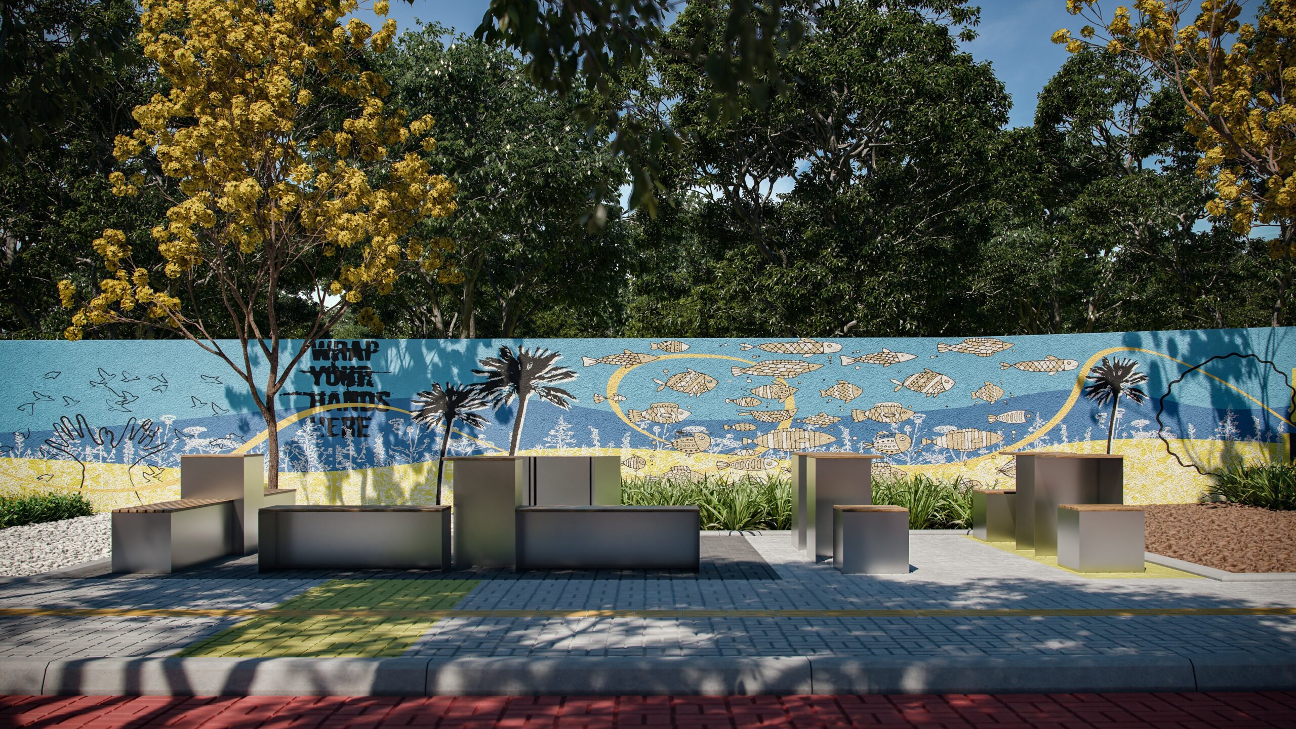 Como elemento de forte identidade cultural, o muro que delimita o parque recebe uma intervenção artística de grande escala, assinada pelo artista cearense Luz. A proposta consiste na representação da fauna do Parque do Cocó em dimensões monumentais, transformando o plano vertical em um suporte narrativo e educativo. Além de qualificar visualmente o espaço, o painel se configura como ponto de atração e interação, estimulando o registro e a permanência dos usuários.