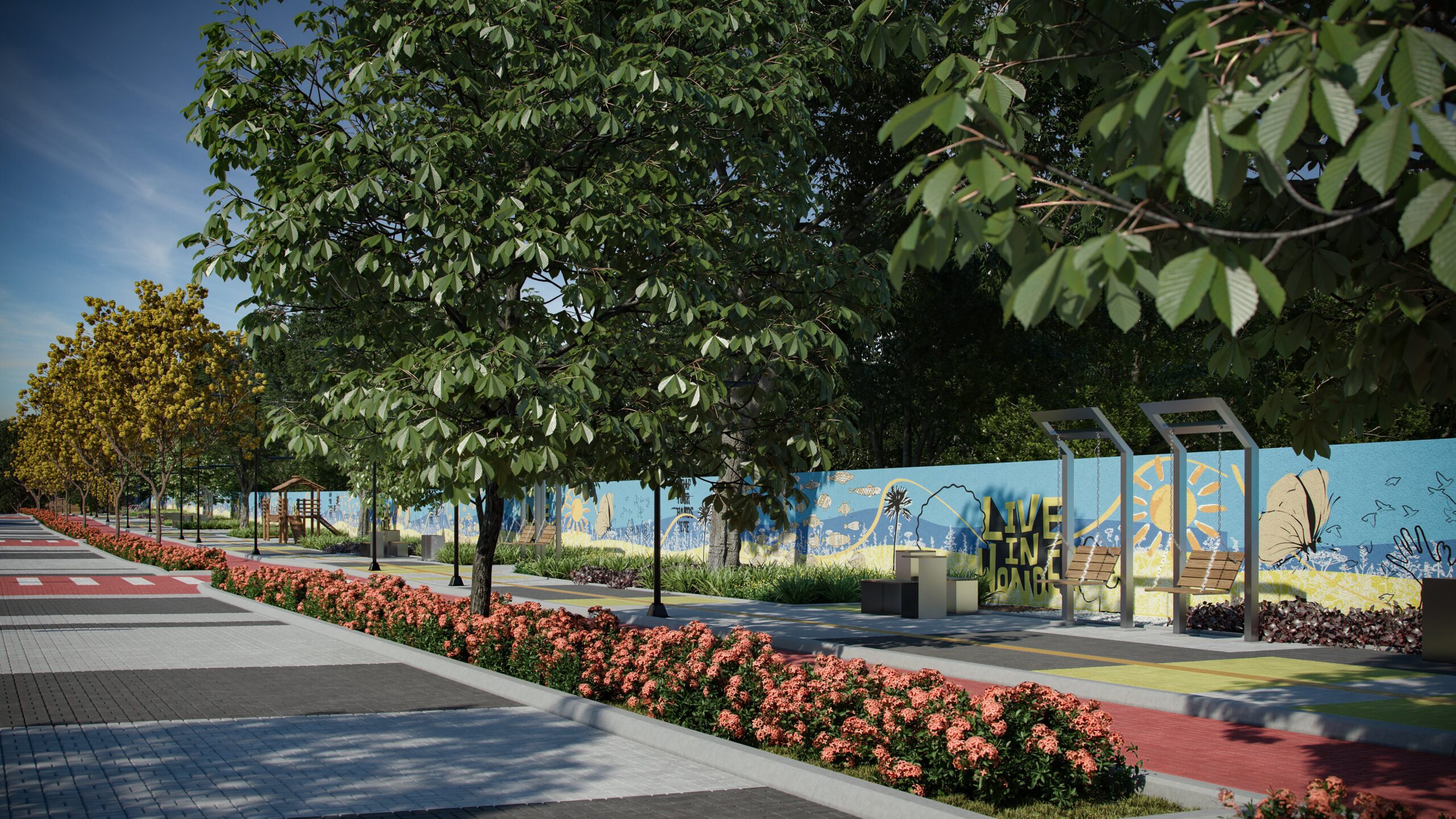 Ao longo do limite com o parque, o passeio se amplia gradualmente, dando origem a uma praça linear que estrutura o sistema de lazer público. Esse espaço abriga uma diversidade de usos, incluindo playgrounds, pet places, áreas de convivência, mobiliários urbanos variados, bicicletários e pontos de apoio, incentivando a permanência e o convívio. Trata-se de um eixo ativo que conecta os empreendimentos e promove a apropriação contínua do espaço.