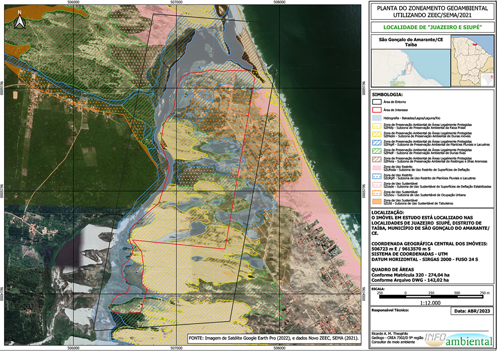 Localizado em uma das regiões mais privilegiadas do litoral cearense, o projeto urbanístico “Enseada do Sol” trata-se do parcelamento do solo mediante loteamento urbano em um terreno com área total de 534.138,13 m² (aproximadamente 53,4 hectares), situado na Praia da Taíba, no bairro Taibinha, município de São Gonçalo do Amarante/CE. O terreno apresenta um formato bastante irregular, porém com qualidades naturais singulares, fazendo limite ao nordeste com o mar e ao oeste com o Rio São Gonçalo, também conhecido como Rio Siupé. A confluência entre o rio e o mar forma uma lagoa de rara beleza cênica, muito valorizada pelos praticantes de esportes aquáticos como o kitesurf — esporte que já estabeleceu essa área como um ponto do circuito mundial.