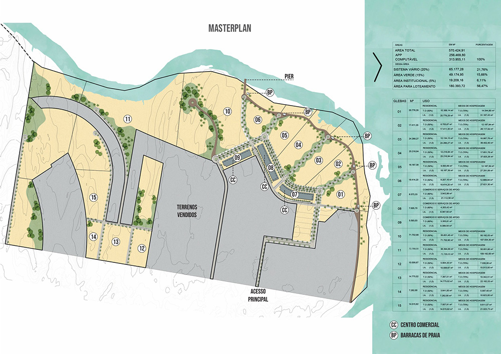 Uma das principais diretrizes foi a criação de um sistema viário com traçado radial, especialmente na porção norte do terreno, para privilegiar os eixos visuais em direção ao mar e ao rio. Essa escolha potencializa o aproveitamento turístico da região, especialmente com a previsão de grandes glebas voltadas para a implantação futura de pousadas e hotéis. Essas glebas estão estrategicamente posicionadas para atender a crescente demanda por hospedagem decorrente do turismo esportivo e de lazer.