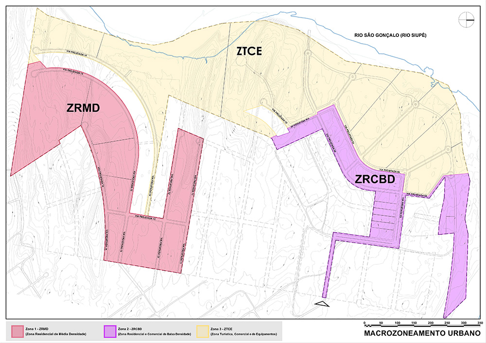 O território do Projeto “Enseada do Sol” fica dividido em três zonas, conforme segue: Zona 1 – Zona Residencial de Média Densidade (ZRMD) Área destinada prioritariamente ao parcelamento em lotes residenciais unifamiliares de média densidade, com foco no equilíbrio paisagístico. Zona 2 – Zona Residencial e Comercial de Baixa Densidade (ZRCBD) Área destinada prioritariamente ao parcelamento em lotes comerciais e residenciais unifamiliares de baixa densidade, com foco no equilíbrio paisagístico. Zona 3 – Zona Turística, Comercial e de Equipamentos (ZTCE) Área destinada às glebas para hotéis, pousadas, comércio, residencial e serviços, concentradas especialmente nas porções norte e oeste, aproveitando eixos visuais para o mar e o rio.