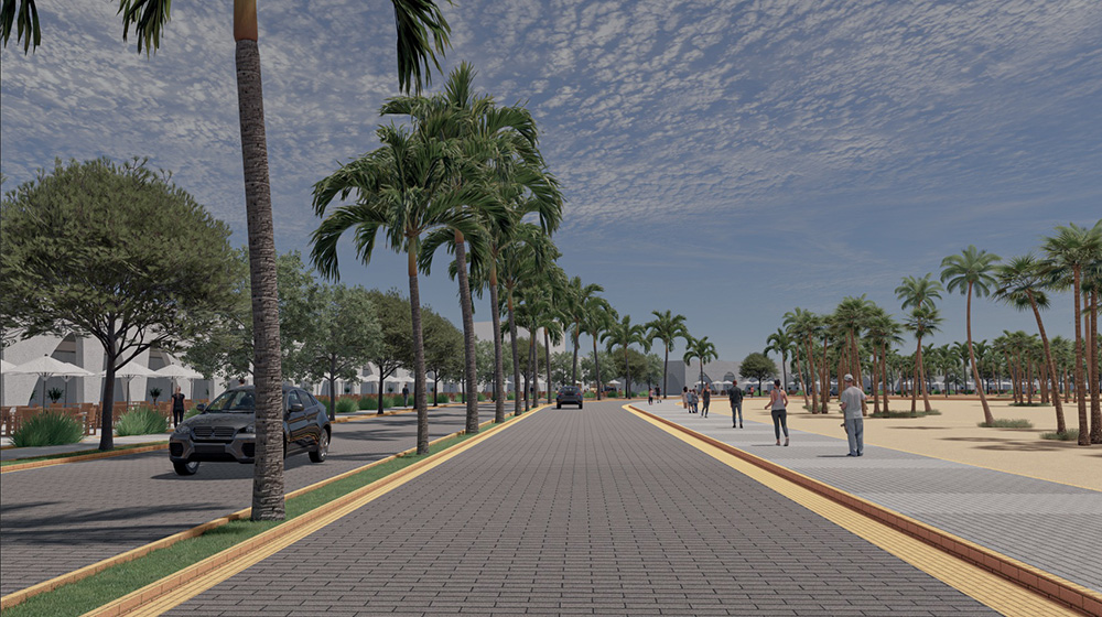 Atendendo a uma recomendação da Secretaria Municipal de Meio Ambiente, foi proposta a implantação de um grande calçadão longitudinal na faixa de transição entre a área edificável e a zona de proteção ambiental (APPs), criando um limite físico de proteção, além de oferecer um espaço público contínuo para caminhadas, lazer e apreciação da paisagem costeira. Este calçadão será interligado ao sistema viário por ruas locais, garantindo acesso democrático à orla do mar e do rio.