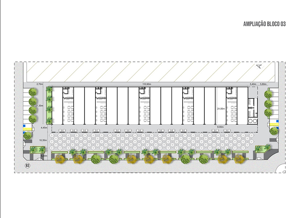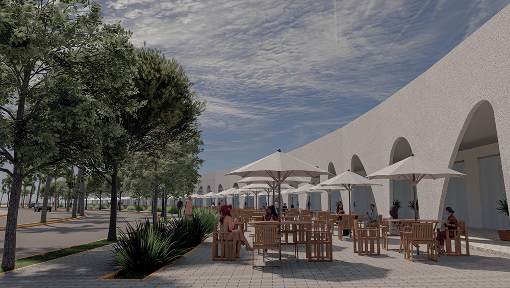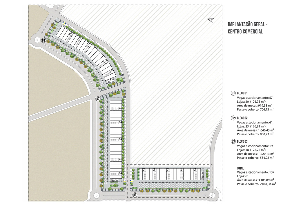 O centro comercial será planejado para abrigar usos variados — comércio de proximidade, serviços essenciais, alimentação e apoio ao turismo — contribuindo para a formação de uma centralidade ativa e reduzindo a necessidade de deslocamentos para outras áreas do município de São Gonçalo do Amarante. Dessa forma, reforça-se a autonomia funcional do empreendimento, ao mesmo tempo em que se cria um ambiente urbano mais dinâmico e integrado.