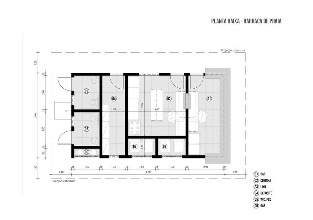 Complementarmente, propõe-se a requalificação do modelo de barracas de praia, substituindo as estruturas atualmente existentes — muitas vezes implantadas de forma precária — por unidades padronizadas, ambientalmente adequadas e arquitetonicamente qualificadas. Essa nova tipologia busca conciliar permanência da atividade econômica tradicional com melhores condições de infraestrutura, conforto e integração paisagística, respeitando as diretrizes ambientais da orla. Assim, preserva-se a cultura local ao mesmo tempo em que se eleva o padrão de uso e ocupação da faixa litorânea.