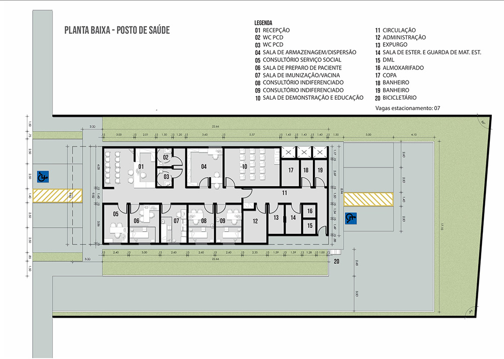 No âmbito dos equipamentos públicos, destaca-se ainda a proposição de uma Unidade Básica de Saúde (UBS), visando atender à demanda futura gerada pelo adensamento populacional previsto para a área. A implantação desse equipamento reforça o compromisso do projeto com a oferta de infraestrutura urbana adequada, garantindo acesso a serviços essenciais e contribuindo para a qualidade de vida dos usuários permanentes e temporários do empreendimento.