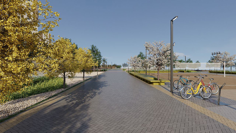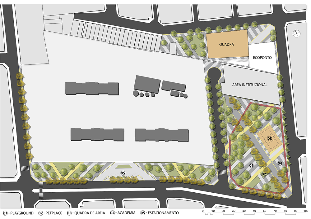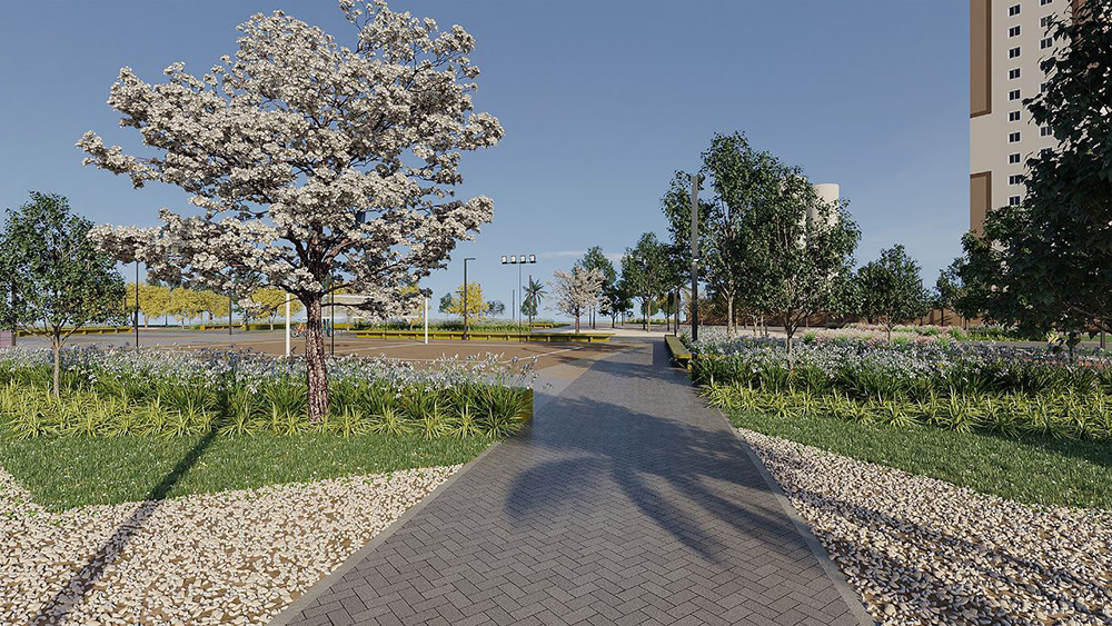 Na praça central, os equipamentos públicos foram distribuídos de forma estratégica, garantindo uso equilibrado e contínuo: academia ao ar livre, playground, pet place, bicicletário, quadra de areia e circuito de caminhada. Esses elementos são organizados por meio de áreas não pavimentadas e eixos de circulação que estruturam o espaço sem fragmentá-lo. Três grandes passeios atravessam a praça, sendo um deles um eixo principal em forma de bulevar, conectando importantes pontos do sistema viário e estruturando a experiência do usuário. Ao longo desse eixo, o plantio de ipês amarelos cria, em determinados períodos do ano, uma cobertura vegetal vibrante, quase cenográfica, que transforma o cotidiano em evento.