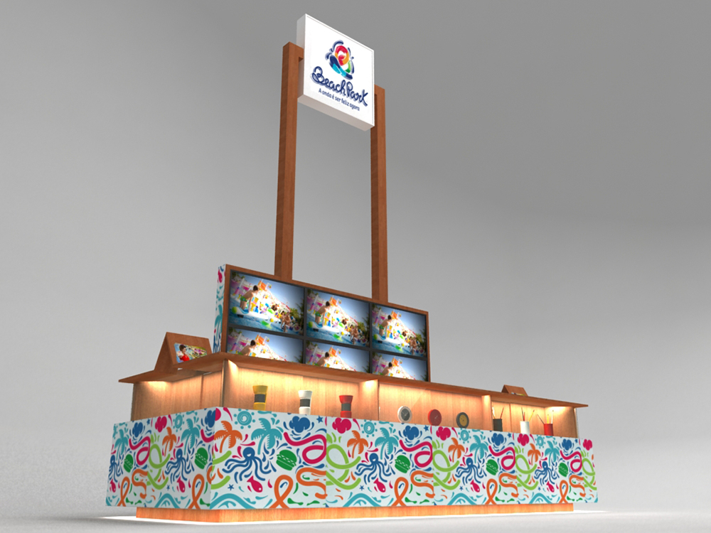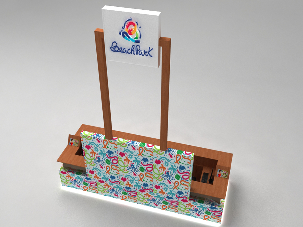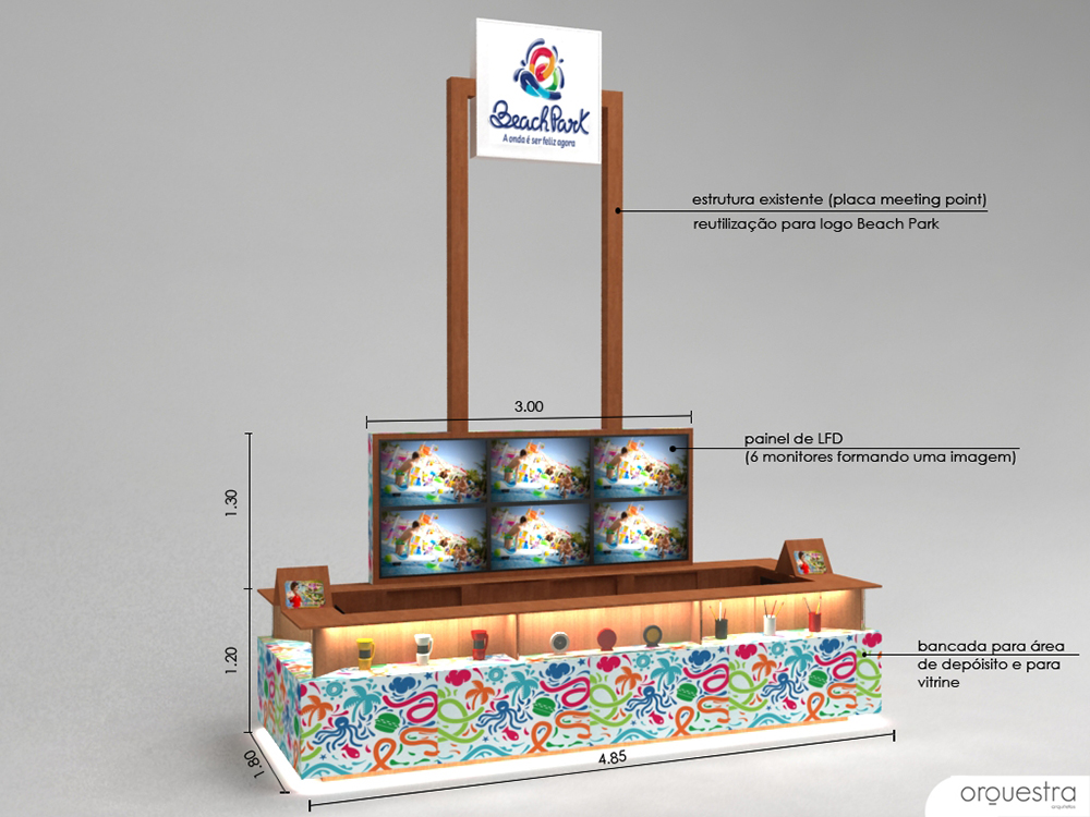 O stand que será implantado neste local tem 4,85 metros de largura e 1,80 metros de profundidade, somando uma área de 8,73 m². Externamente, é possível visualizar os produtos do Beach Park no expositor de vidro incolor com iluminação interna. Além disso, existe no balcão um display para exposição de panfletos promocionais. O revestimento externo do stand é feito por folhas de mdf adesivadas com os pictogramas característicos da nova identidade visual do Beach Park.