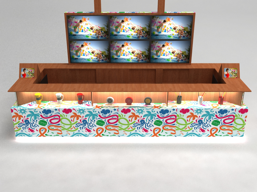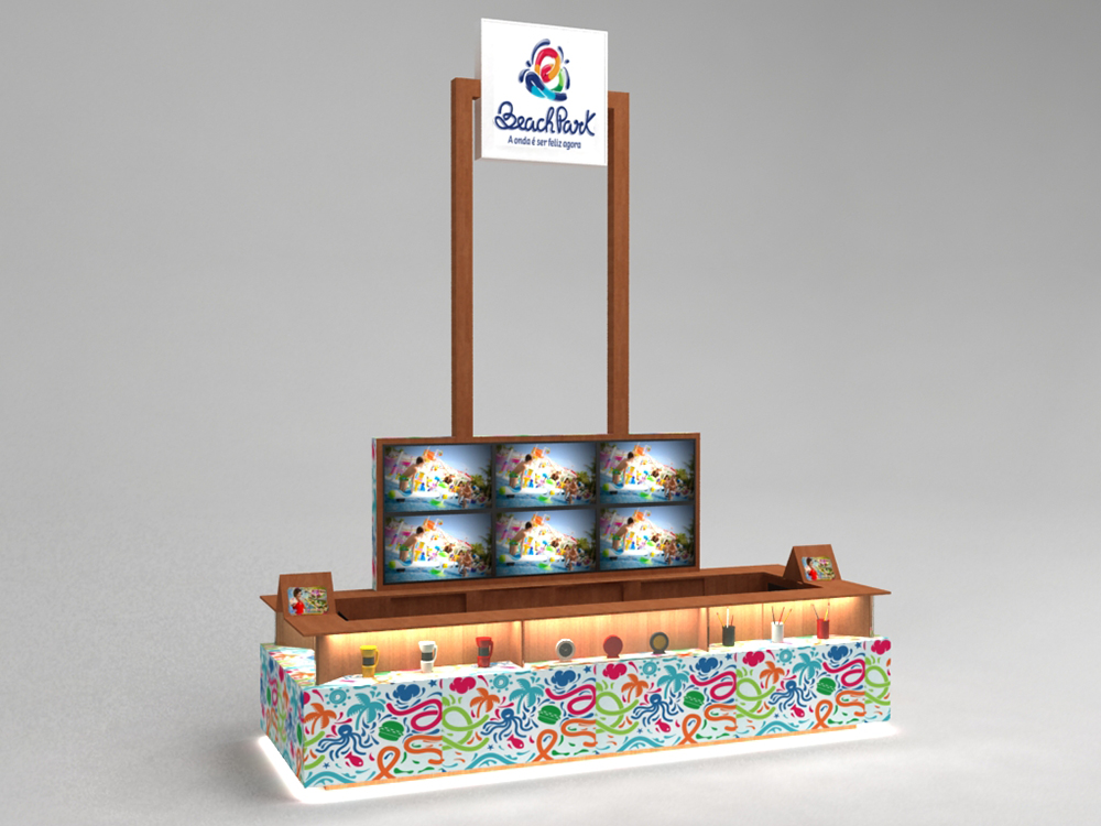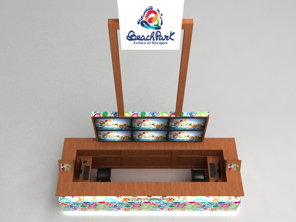 Na parte posterior do stand, foi inserida uma caixa em mdf que servirá de moldura para seis telas de 42”. Este conjunto possui 1,30 metros de altura que, somado a altura de 1,20 metros do balcão resultam num total de 2,50 metros. Estas televisões exibirão vídeos promocionais e publicidade do Beach Park.