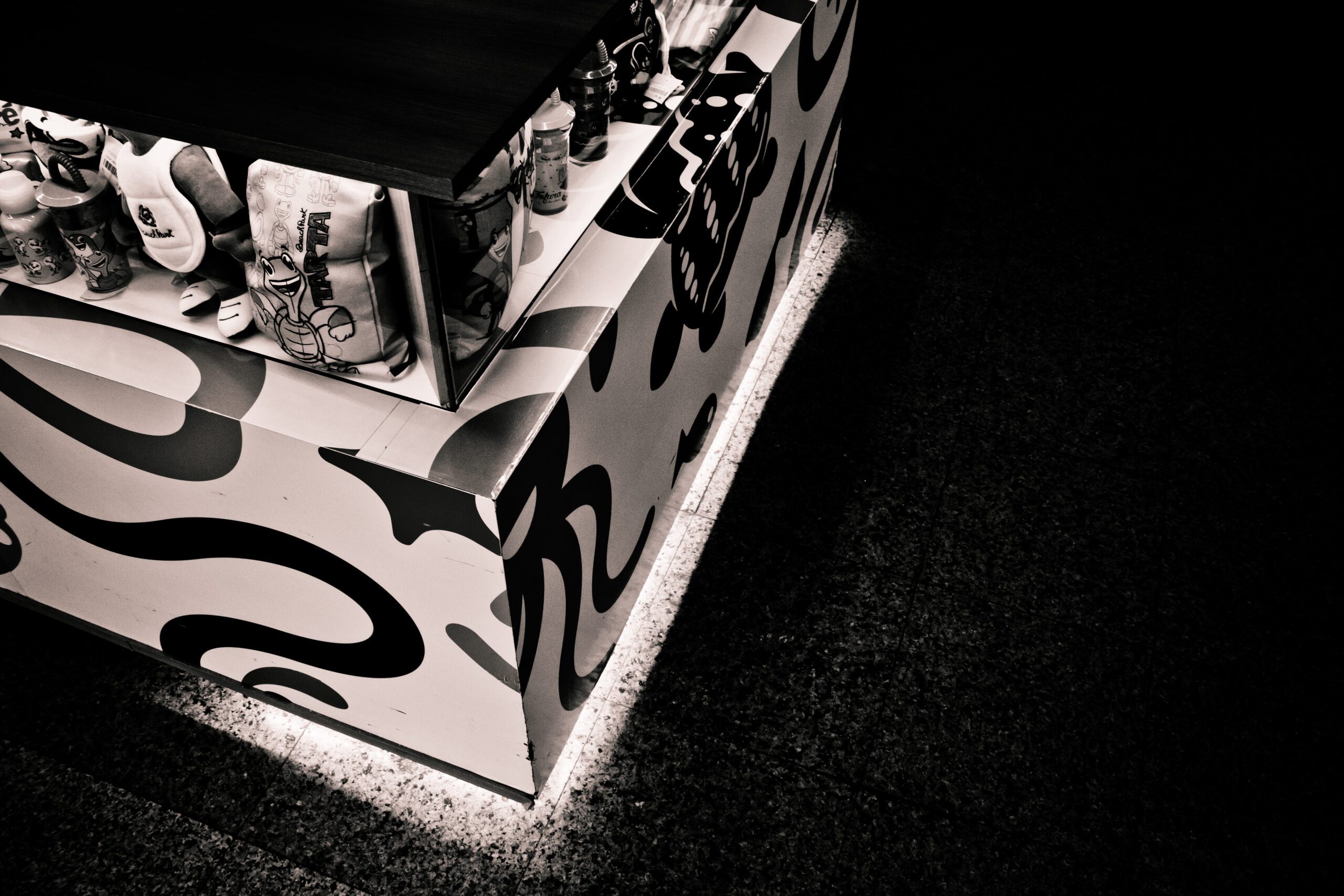 A parte interna do stand possui espaço para duas pessoas. Existem também duas bancadas que têm a função de apoiar os computadores. É possível acessar a vitrine por dentro do balcão através de portas corrediças feitas em mdf. Em um nível abaixo dos produtos expostos na vitrine iluminada, existem armários que têm função de depósito de materiais.
